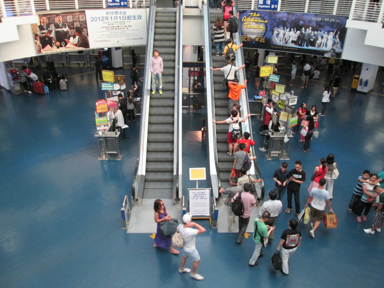 週末の金、土、日が混む傾向です。6/29(土)、香港からマカオフェリーターミナルに到着した際、フェリーは満席でターミナル内も旅行客で混雑していました。入国審査は中国系の方とは別審査となるため、10分程度で終了しました。7/1(月)、香港に戻る際、利用しましたが、ガラガラで空いていました。