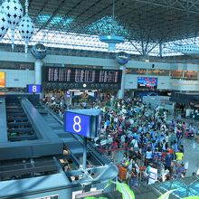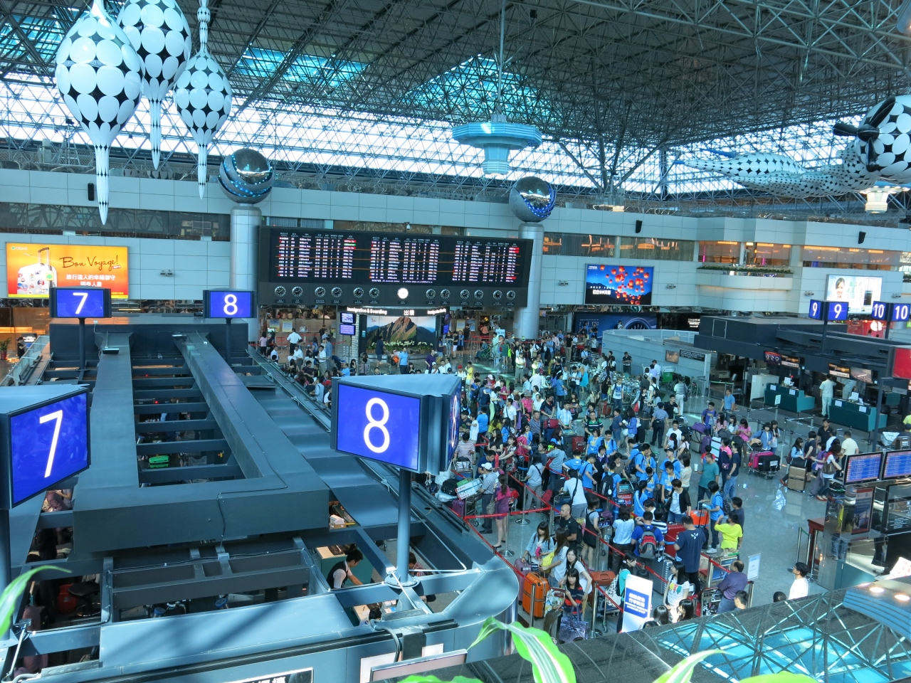 国際空港なので、松山空港と比べると広大です。チャイナエアーやキャセイは行き先によってターミナルが変わるので要注意。ターミナル間は無料のモノレールが走っています。6月最後の土日は卒業旅行シーズンなので、学生でごった返していました。