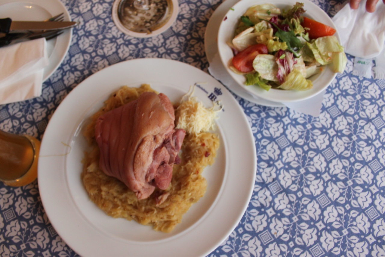 夫はアイスバインを食べたいと言って英語のメニューを見たら、「ババリア風の豚の足首」という表現のがあり、それを注文。蒸すのか焼くのかを聞いてくれたので夫は「蒸す」方を選択。思ったようなのが出てきて喜んでいた。他の人はこれを焼いている方を頼んでいる人が多かった。付け合わせと共にボリュウム満点。私は昼にソーセージを食べたので控えめにスープとサラダ、アイスクリーム。ビールとワイン、チップ込みで32ユーロくらい。人気の程が分かった。