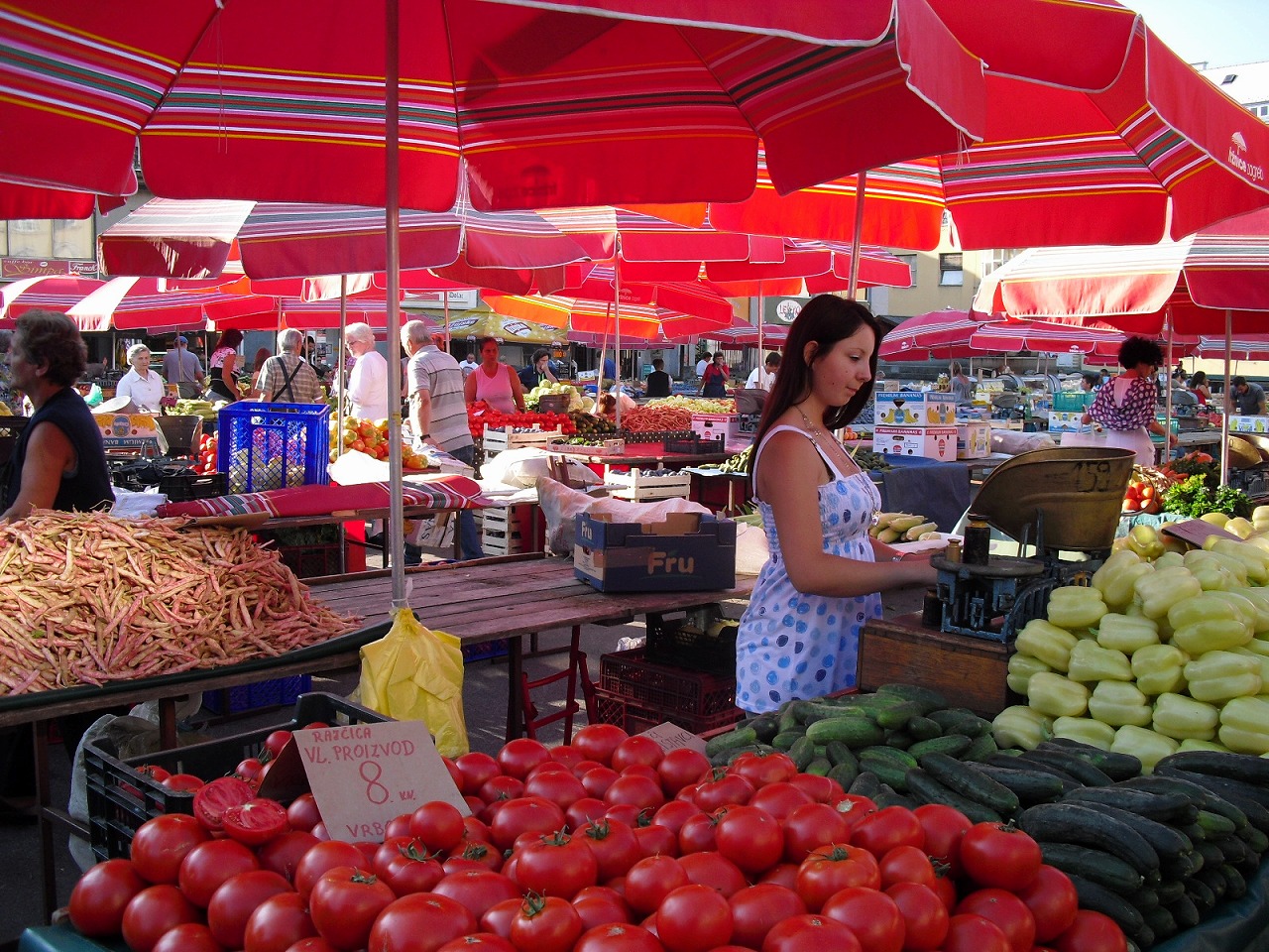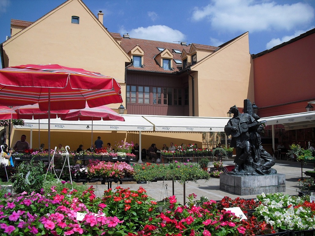 広場一面に赤いパラソルがぎっしりと並び、青空の下、鮮やかに映えるザグレブの市場。そのパラソルの下には新鮮な野菜や果物が色とりどりに並べられている。見ているだけで楽しくなってくる。早朝から、市民と観光客でにぎわっている。