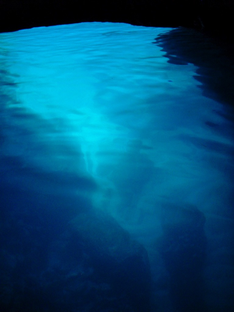 暗闇の洞窟の中、突然海面が青く幻想的に光を放ちます。