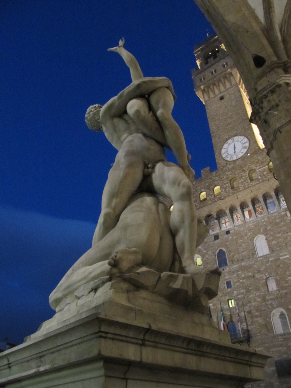 ドゥオーモ周辺と並んでフィレンツェの目玉的な観光の中心。オフシーズンなのに人出がすごかった。それゆえなのか、とても泥棒が多いらしい。夜に行くと屋外に展示された彫刻をとても美しく写真におさめることができる。ウフィツィ美術館はすぐそば。