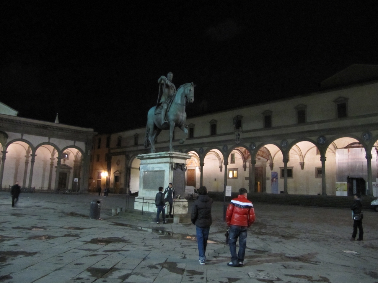 ドゥオモから北東方向,歩いて10分くらいの場所にある広場。捨て子養育院が面している。真ん中にある騎馬像がカッコ良かった。また広場に面した回廊が美しい。夜はヤンキーっぽい若者がたくさんたむろしていて歩く際にも絡まれないかびくびくしていた。