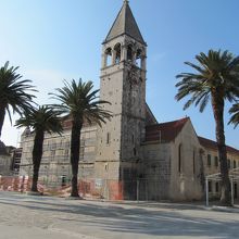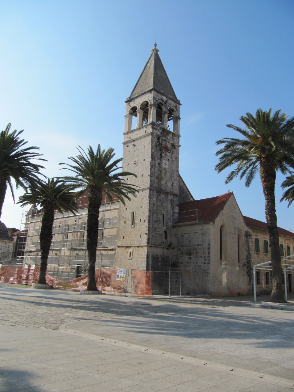 海沿いにある鐘楼の美しい教会。2011年に行ったときには工事中で中にも入ることができなかった。海に面していて、そこにはボートやヨットが止まっている。小さな町なので、トロギールの町に来たならば、迷わずにつくことができると思う。