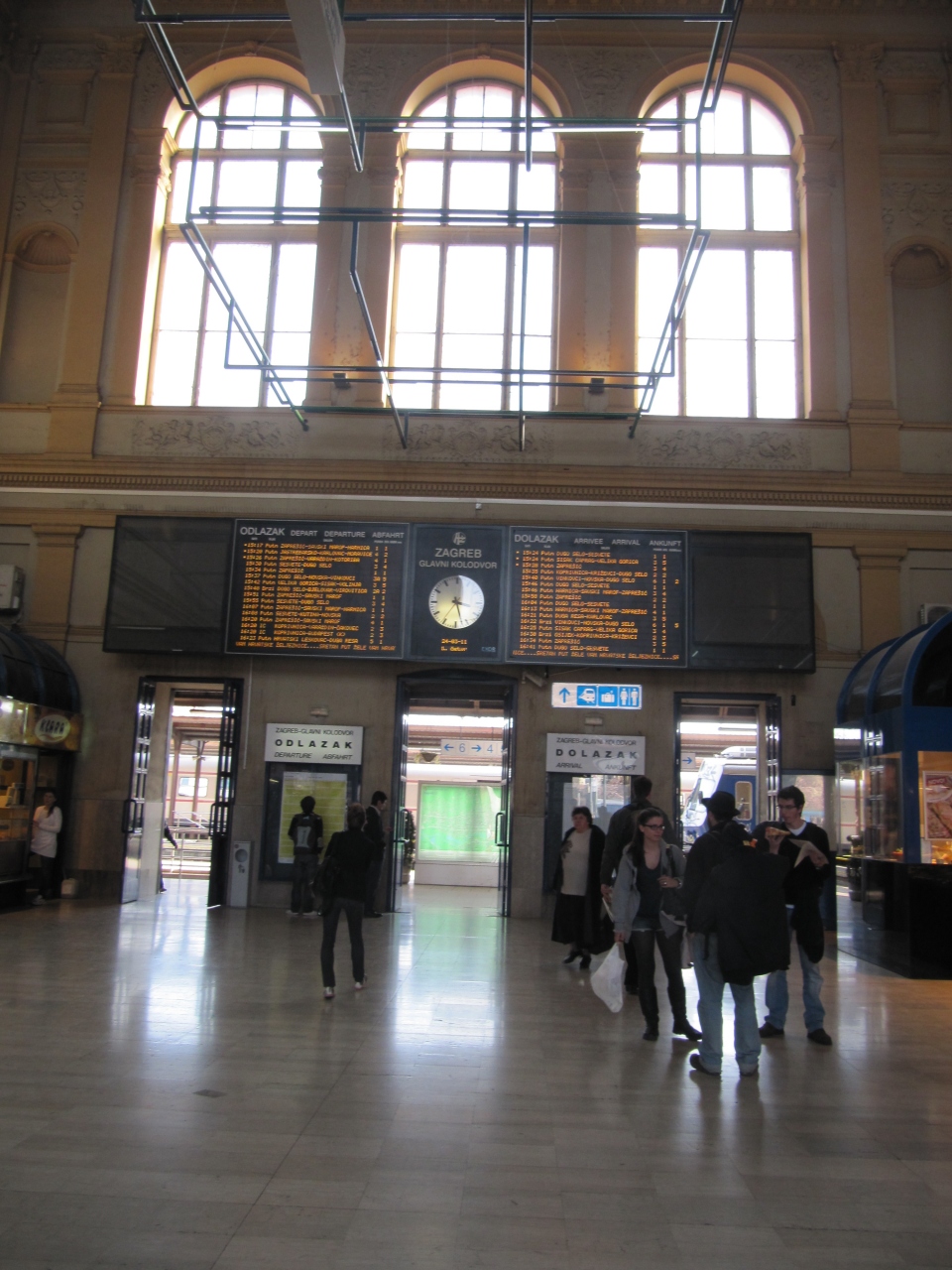 クロアチアの玄関に当たる駅。ヨーロッパによくある豪華なタイプの駅。たしかコインロッカーがあったと思う。駅前にはトミスラフ広場があり、芝生に寝そべってごろごろしている人がおり、その広場沿いには日本大使館がある。