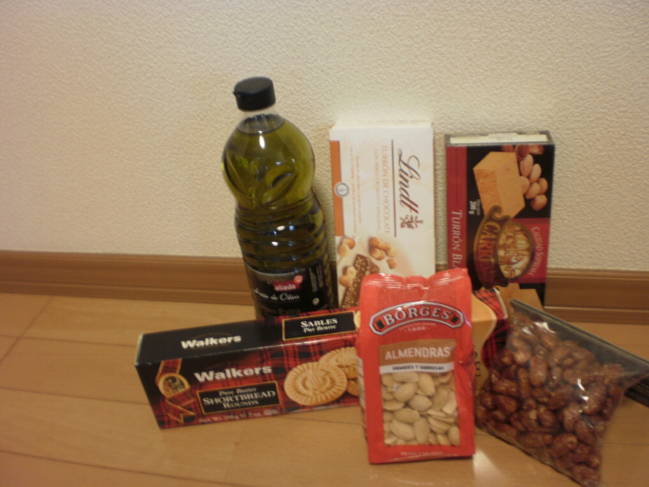 アーモンドのお菓子、ワイン、オリーブオイルはプラスティックのボトルの小瓶、ホワイトアスパラやムール貝の缶詰などなど、帰国してからの試食が楽しみです。