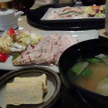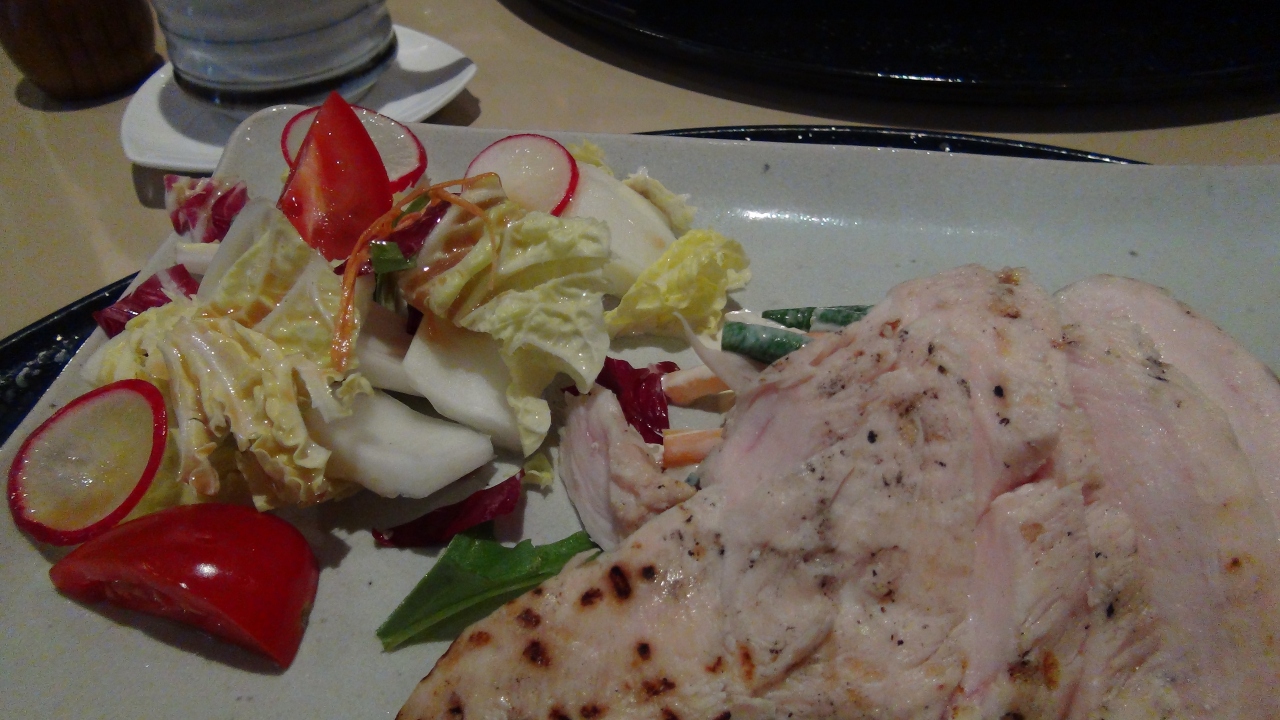 添え物野菜は、チコリ、ハクサイ、緑の野菜・・忘れました・・がゴマ油風味で味付け。