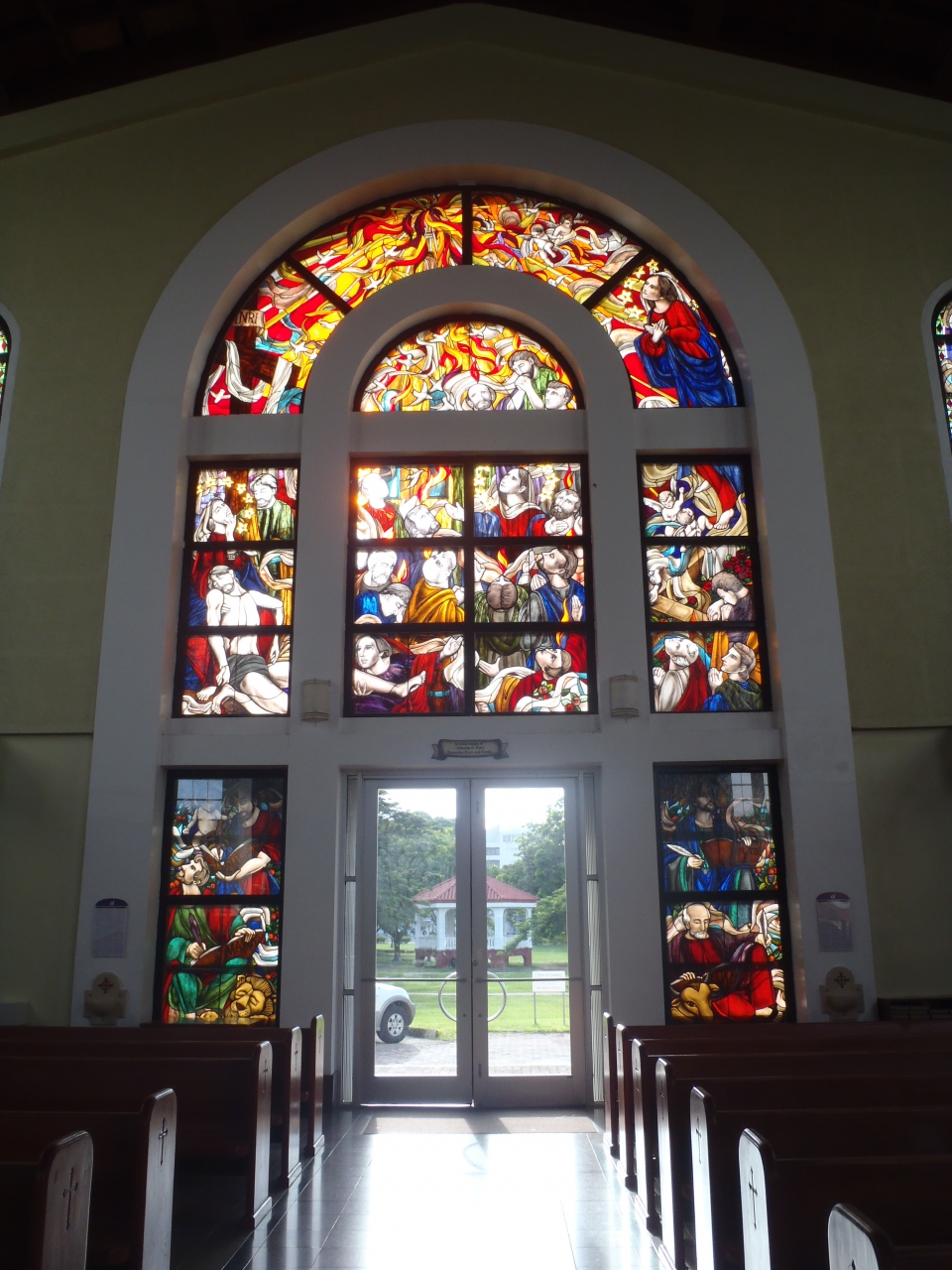外見も白くてきれいな教会ですが、ステンドグラスに感動!