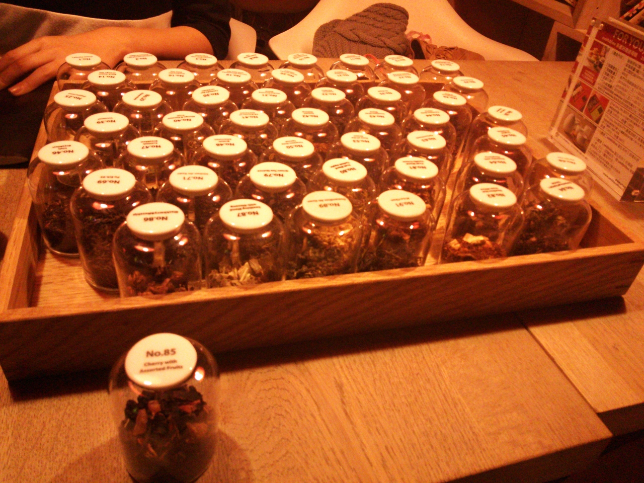 たくさんの小瓶に入った茶葉とメニューを渡されて、この中から好きな香りのお茶を注文します。これが楽しくて♪