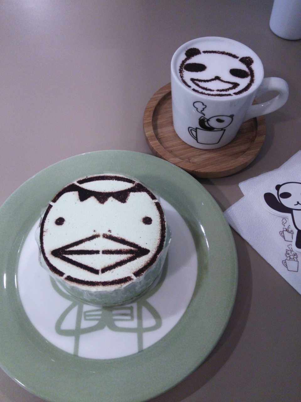 うさぎや熊、河童のケーキがあり、悩んだ末に河童のケーキを注文。ついでにパンダのカプチーノも頼みました。