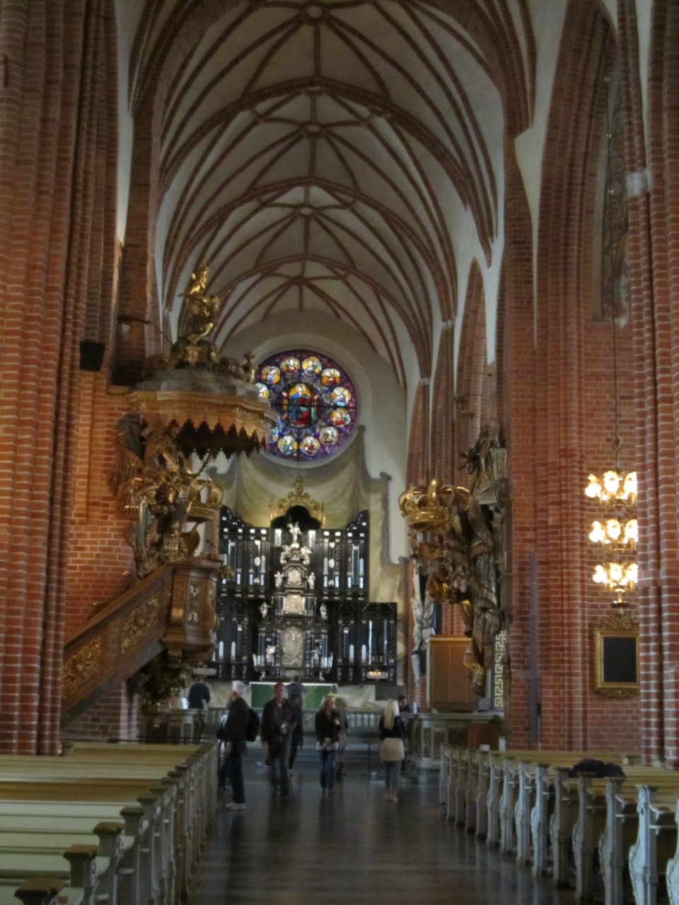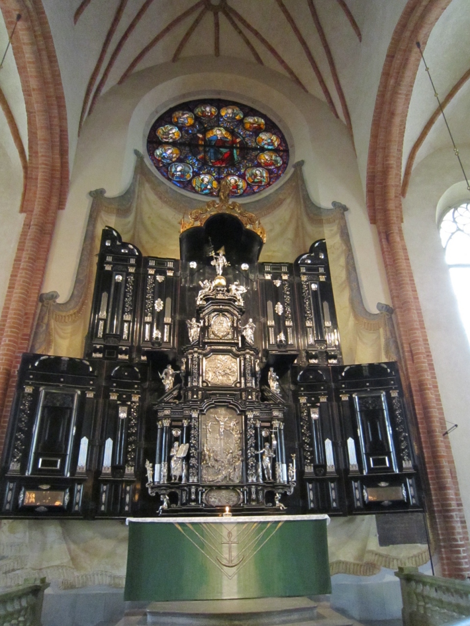 中は薔薇窓の下の黒い祭壇が印象的です。
