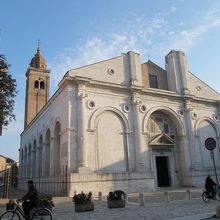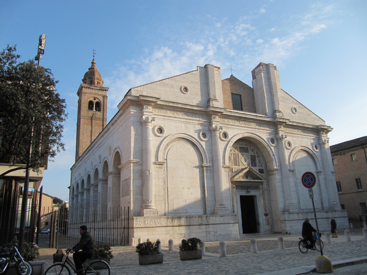 未完の教会。白いファサードも未完成のため後ろの煉瓦の石組みが正面から見える。リミニ駅から歩いて行ける範囲にある教会で、建物も非常に目立つので迷うことはないと思う。内部にはフレスコ画があるらしい。自分が行ったときはあいていなかった。
