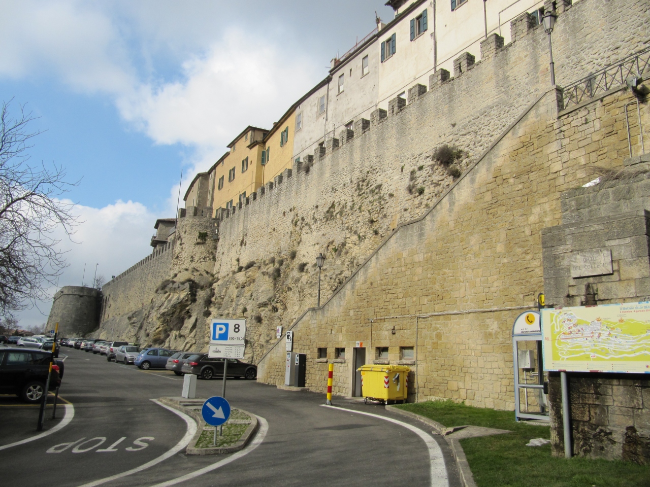 サンマリノの町をぐるっと囲む要塞。堅牢さを実感させるサンマリノの要塞。岩場とうまく融合して美しい風景となっている。サンマリノが都市国家であることを実感させてくれる。冬には少し雪が残っていてそれもまたきれい。