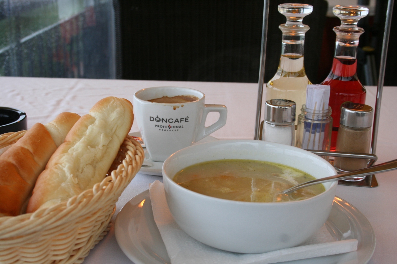 おしゃれなカツ的なメインにスープ、パンにコーヒー。