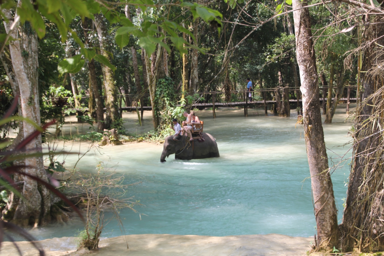 象さんの背中を降り、水着を持って小さなボートに乗り換え、滝を目指します。