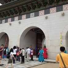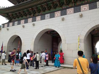 地下鉄で行った為、最初は門の内側から光化門を見学していると、守門将の交代儀式が始まりました。カラフルな衣装など、ドラマのシーンそのもので、非常に見ごたえがありました。その後、門の外に出て記念撮影。守門将の人と一緒に写真を取っている人が多かったです。