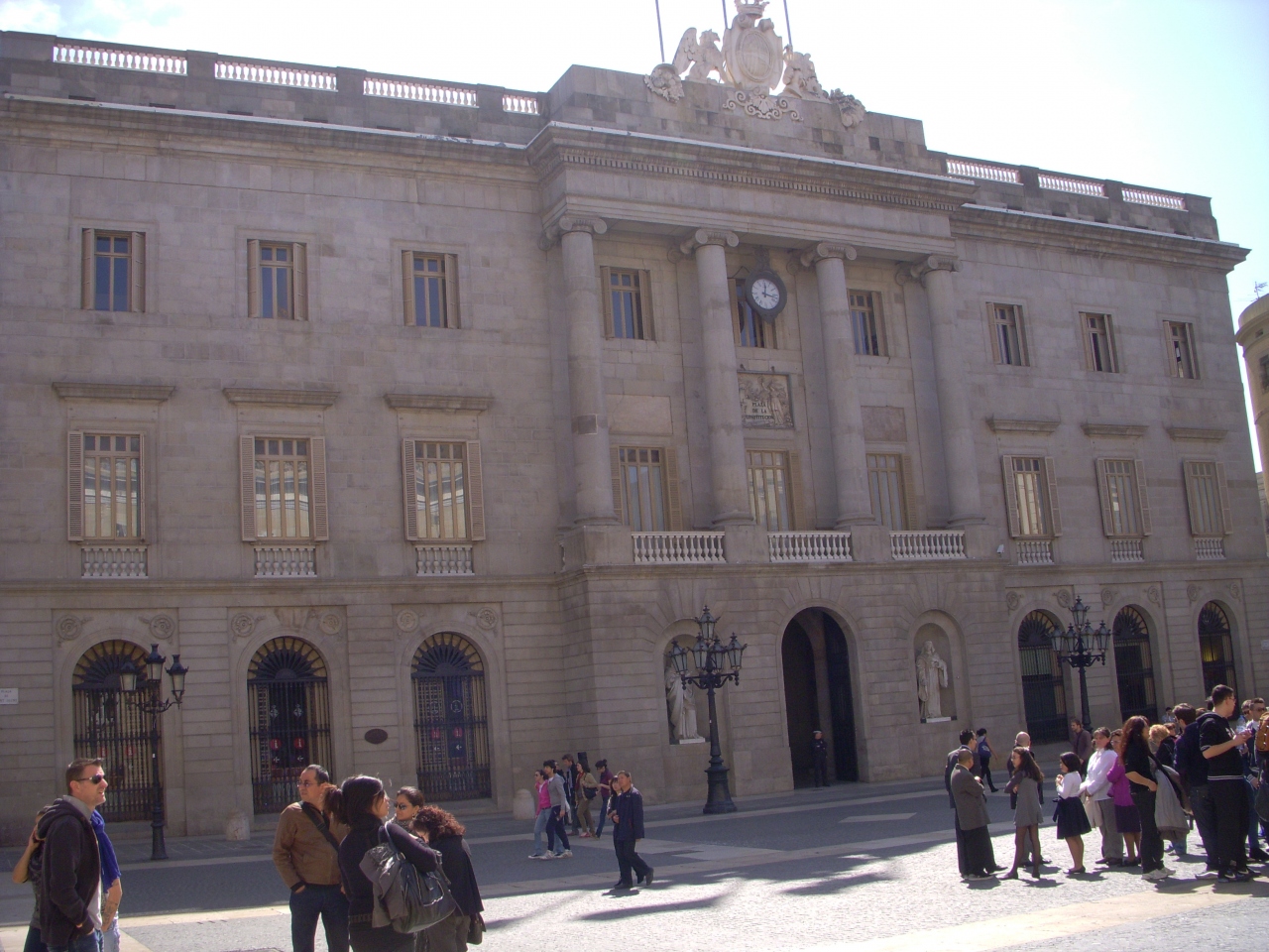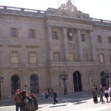 ランブラスを抜けるとサン・ジャウマ広場というところに出ました。そこにドーンとそびえたっていたのが市庁舎でした。真ん中にはスペイン国旗3本がたっていて、かっこいいですね。手前が広場なので、すごく落ち着いた雰囲気でした。