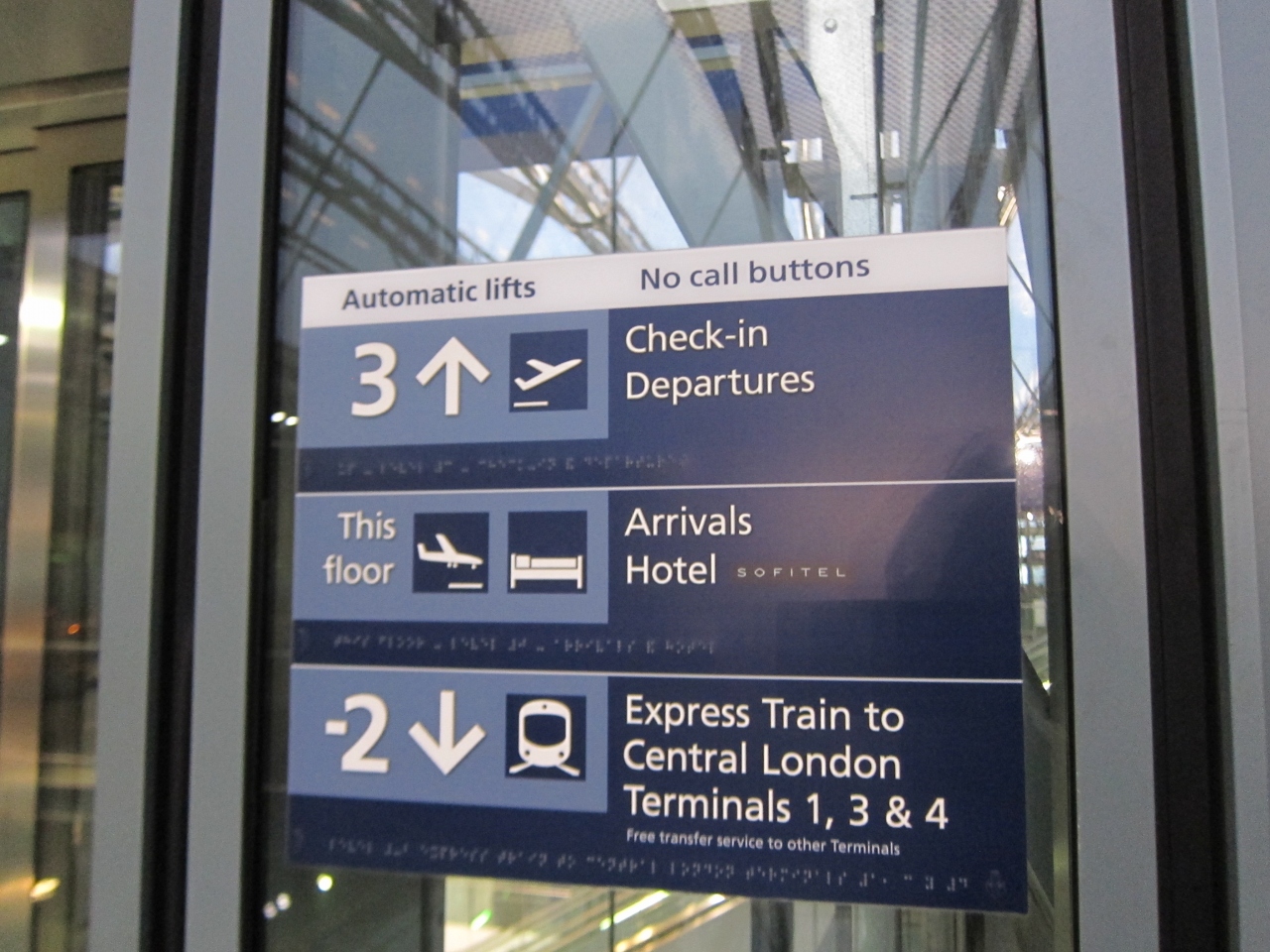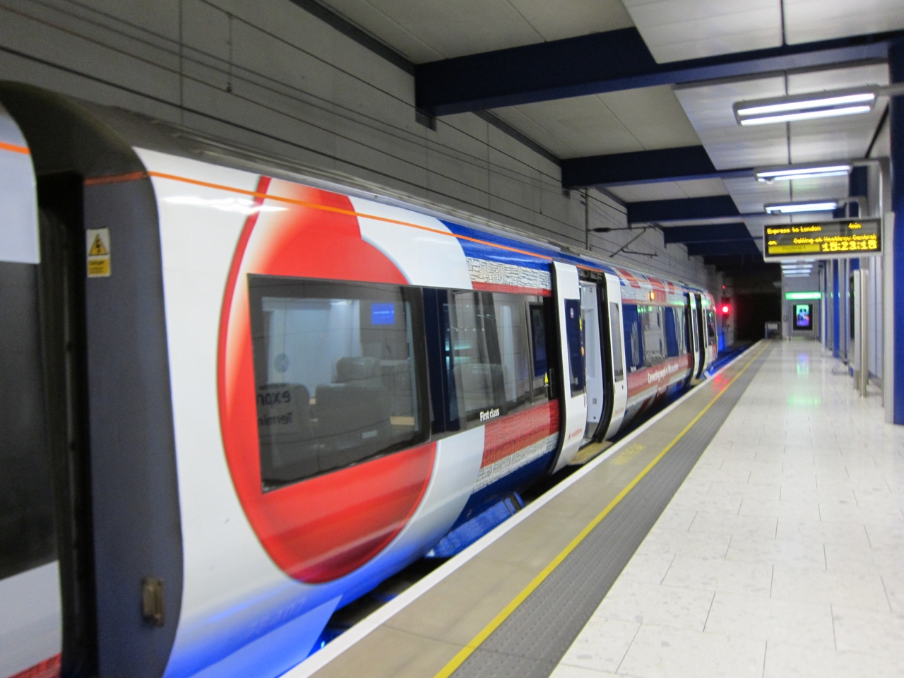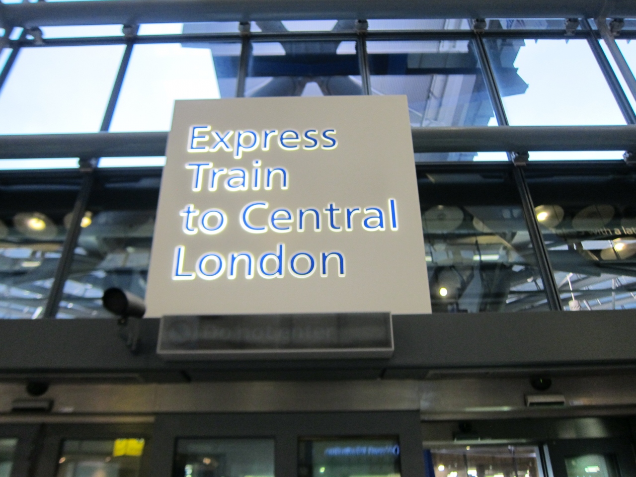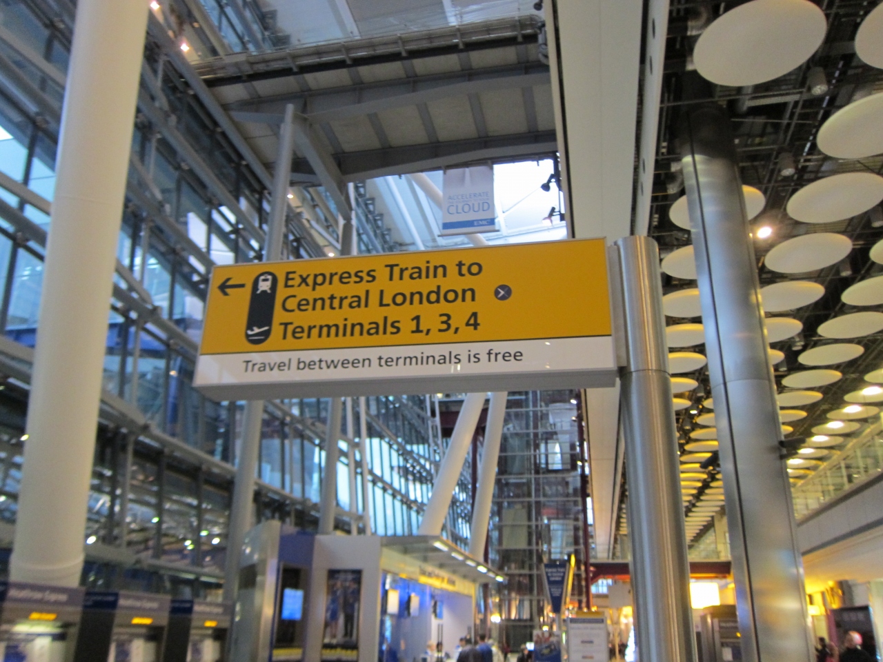 ヒースローエクスプレスにタダで乗車です。といってもTerminal5からTerminal1,3,4までの間です。この間の移動にはとても便利。Terminal5からTerminal1,3,4に移動しようとすると、案内看板のTerminal1,3,4に”Express train to Central London”が併記され、更に”Travel between terminals is free”の表示があります。このまま乗って行ってしまうとロンドン中心部、パディントン駅まで行き、通常18ポンド取られてしまいます。しかし20分あまり。混んでいてなかなか座れず、車内も小さくて狭い地下鉄Piccadilly Lineで各駅に止まりながら1時間以上揺られるのと比べるとかなり快適です。設備も新しくきれいですが、時間に余裕があり、4.5ポンドと安く、また、雰囲気を味わっていきたいなら地下鉄でもよいと思います。Piccadilly Lineは各種乗り継ぎに便利なEarl’s CourtやGreen Park、大英博物館のHolbornなどを通ります。Paddingtonは結構使い勝手のよいCircle LineやDistrict Line、Bakerloo Lineが接続します。付近は宿が多いですが、Earl’s CourtやVictoria近辺に比べたらやや高めです。