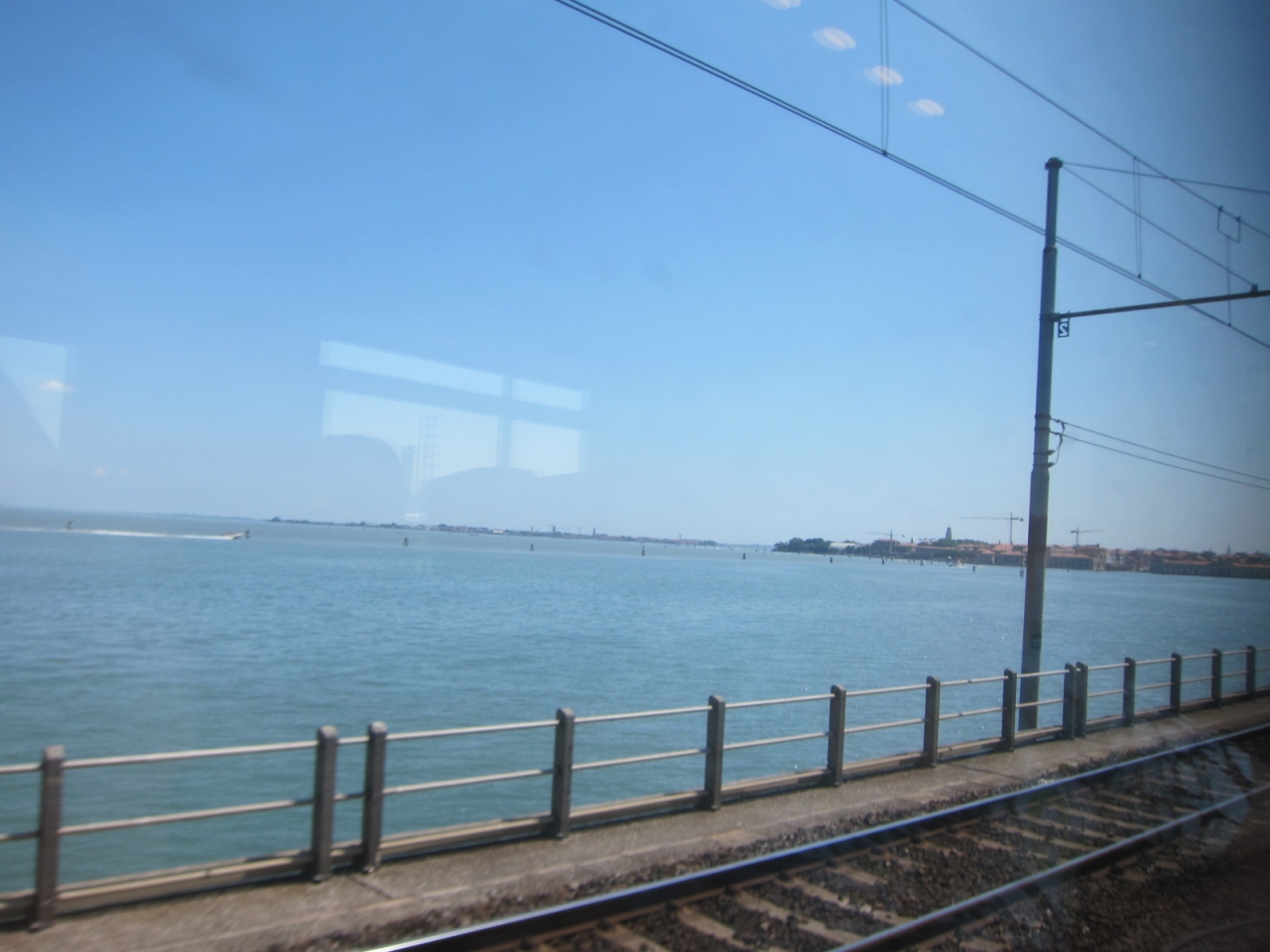 ミラノ中央駅からヴェネツィア、サンタ・ルチーア駅まで利用しました。所要時間2時間30分あまり。幸いにして出発直前にホームの自販機で切符を購入できました。席を指定して窓側。進行方向左側(北面)に座りましたが、途中、ガルダ湖などが見えました。席はコンパートメントの4人掛。テーブルの横に電源コンセントが付いていて便利でした。お客は景勝地、ガルダ湖のところと、ヴェネツィア、メストレ駅で結構降りていきました。ヴェネツィア、サンタ・ルチーア駅までの海上橋は、右側に車道橋が架かっています。橋は10分あまりで通過し、すぐサンタ・ルチーア駅ですが、まるで日本の浜名湖を新幹線または東海道線で通過する雰囲気に似ていました。