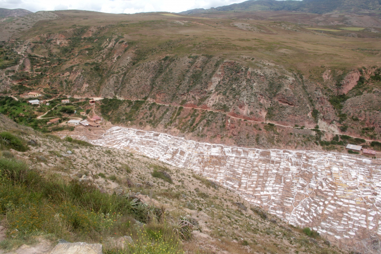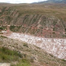 クスコの町から北へおよそ60km。高濃度の食塩泉を渓谷の斜面に作った塩田で天日干しして塩の生産をしています。アンデス地域で唯一生産された貴重な塩で、インカ帝国時代は生産を国が一括管理して、領土全体に分配していたのだそうです。渓谷の斜面に小さな区画に区切られている塩田ですが、現在約3、800もあるそうで、そのひとつ1つは地元の人々が代々所有しているとのことです。生産は乾季にのみ行われますので、見学も4月から9月ころとなります。