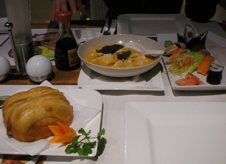 日本料理も含むアジアのFusion restaurantと書いてある、ORIENTAL GARDEN。オーダーしたのはトムヤムクンとサラダ、寿司と海苔巻き単品でいくつか、鶏肉のカリー、それと中国パン。観光地なので味はそれなりですが、悪くはありません。食事をしていると、突如音楽と共にオリエンタルな格好をしたお姉さんが踊りながら登場しました。