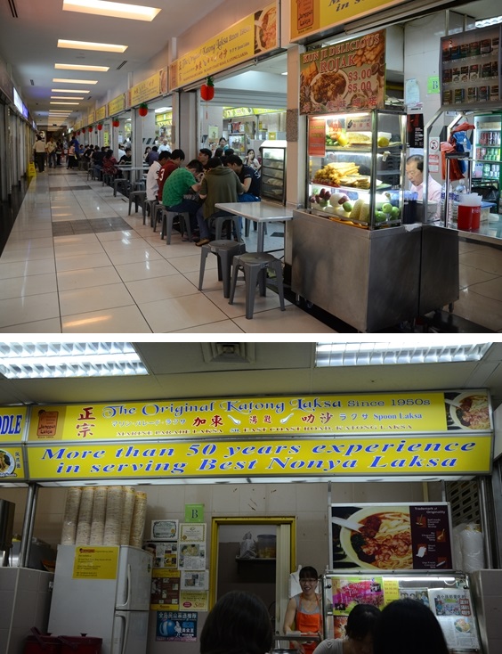 マリン・パレード・ラクサがある小さなフード・コートの通路には、『MARINE PARADE LAKSA * MORE THAN 50 YEARS EXPERIENCE IN SERVING BEST NONYA LAKSA』という黄色い看板が連なっていて、お店の有名度を示す眺めになっています。