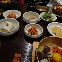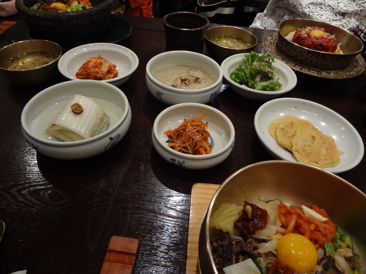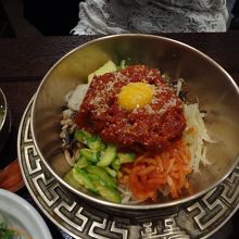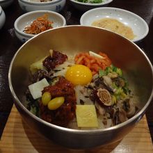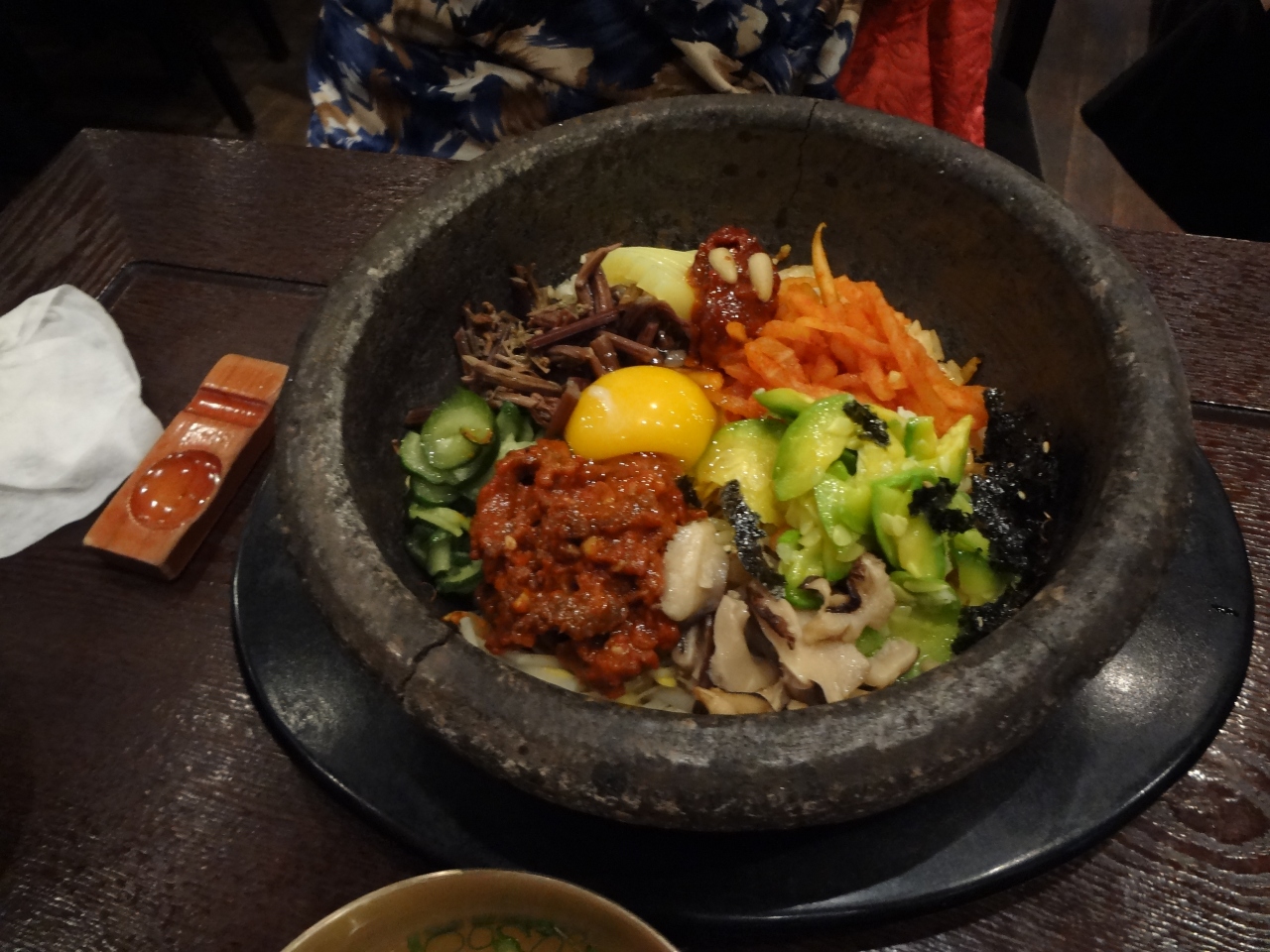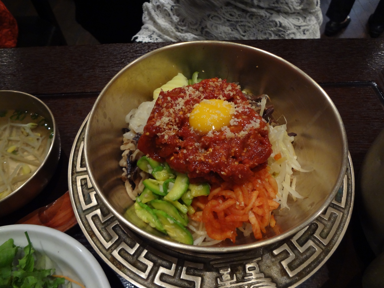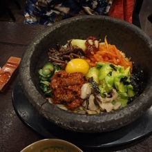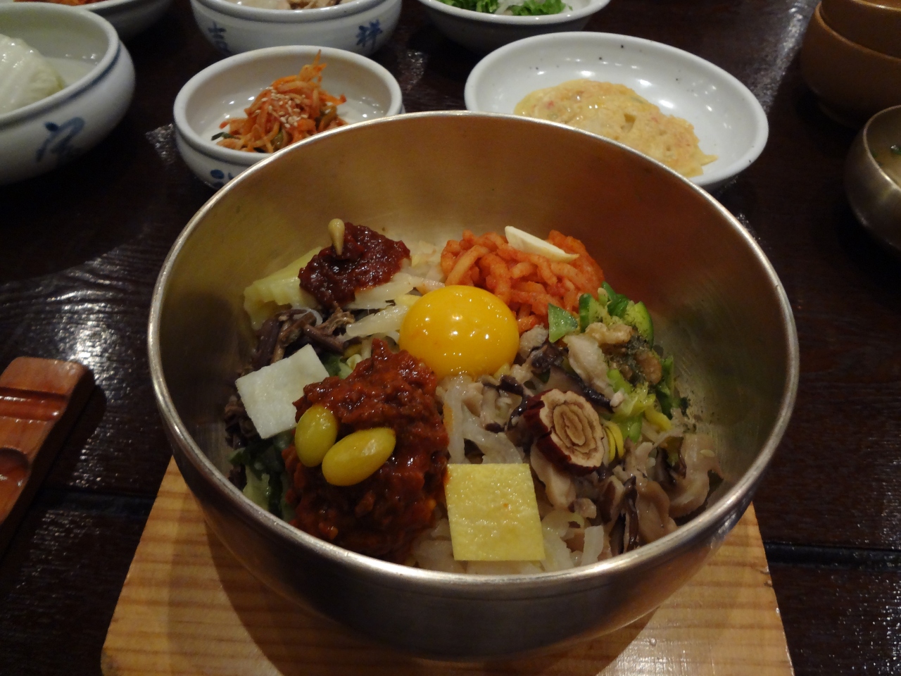 私が食べた「全州伝統ビビンパ」は、熱々の金属製の器に盛り付けられていて、石焼ほどではなくても、生卵に十分火が通りました。色々な物が乗っていて、色も綺麗、味も量もちょうど良かったです。