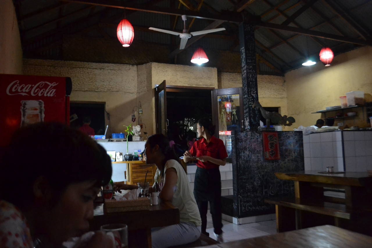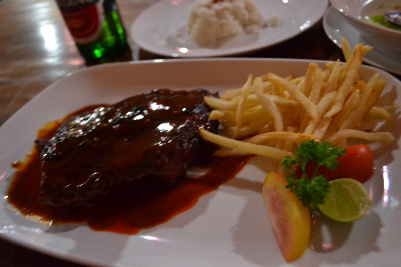 ジンバランといえばシーフードが有名ですが、カーチャーターのガイドがシーフードよりも安いからと連れて行ってくれました。日本語のメニューもあるので、ワルンとしては高い方かも…。店の前でスペアリブを焼いています。ソースの味が少し濃いけれど、しっかりボリュームのある肉を食べたい時にお勧めです。