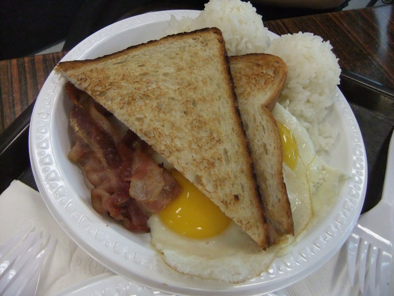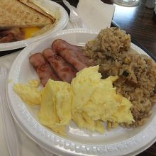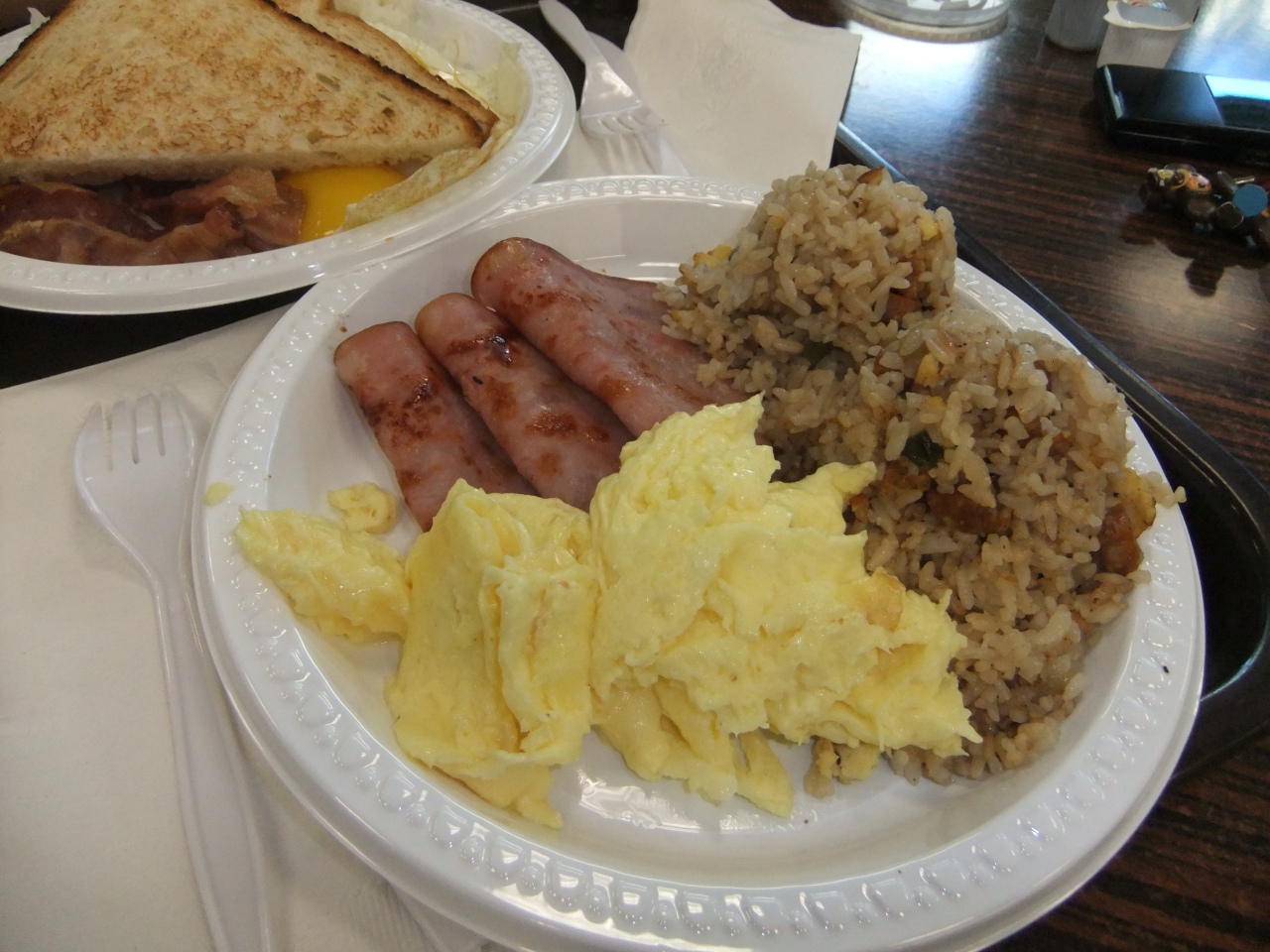朝食しか食べてませんが、スパム、ベーコン、ハムなどから1品、卵2個の料理、白御飯かフライドライスなどをチョイスするタイプを食べました。