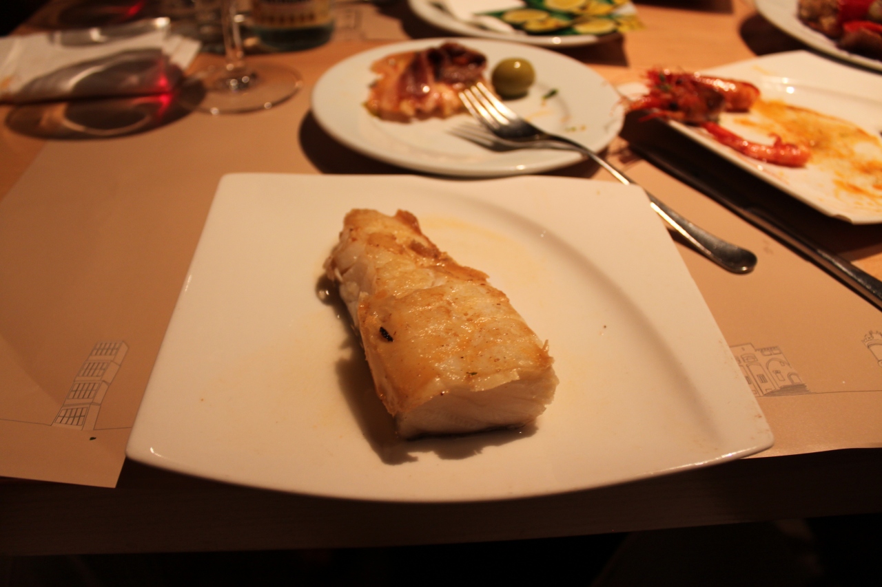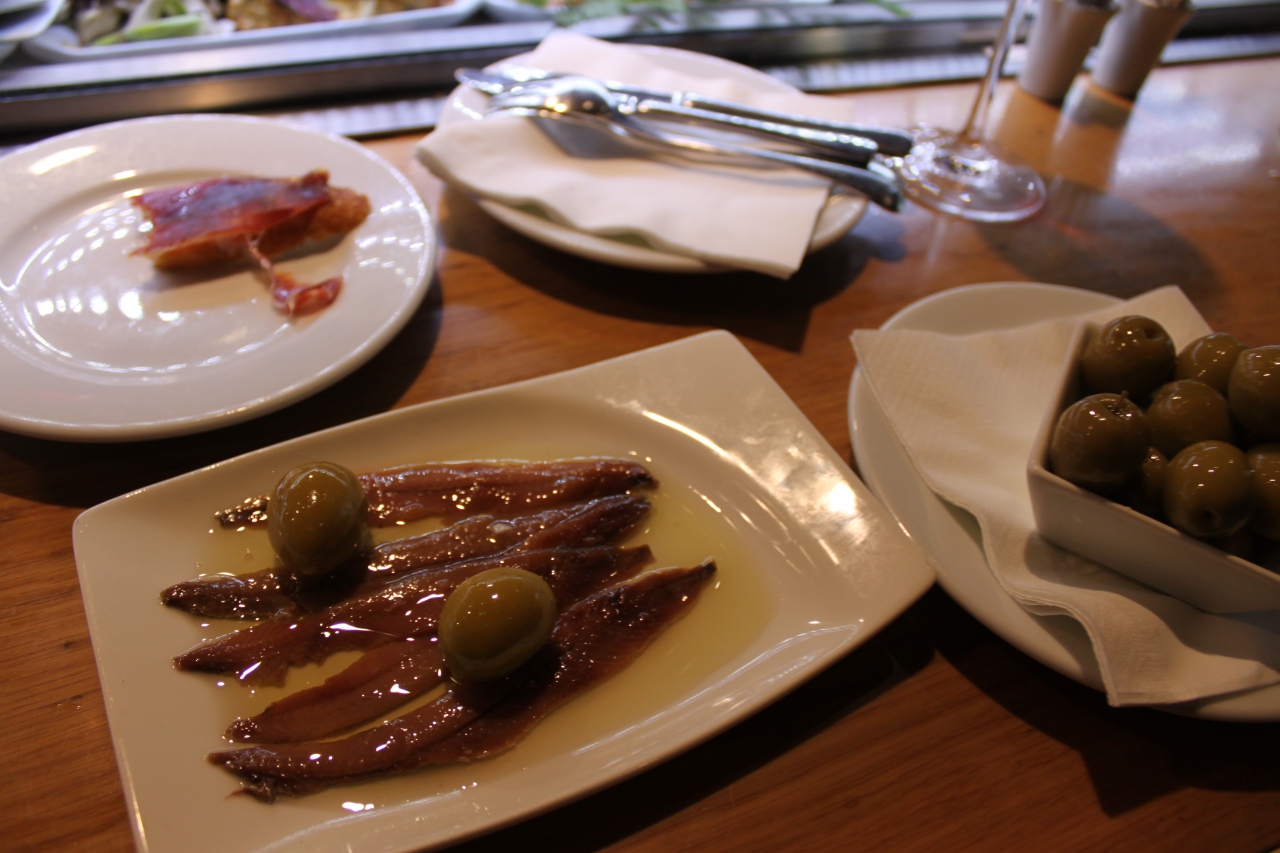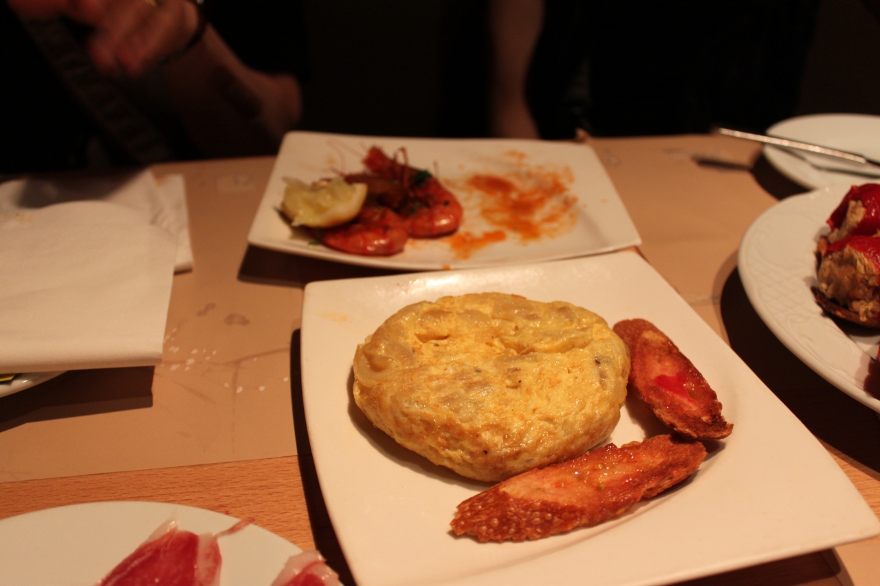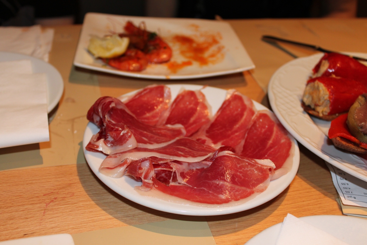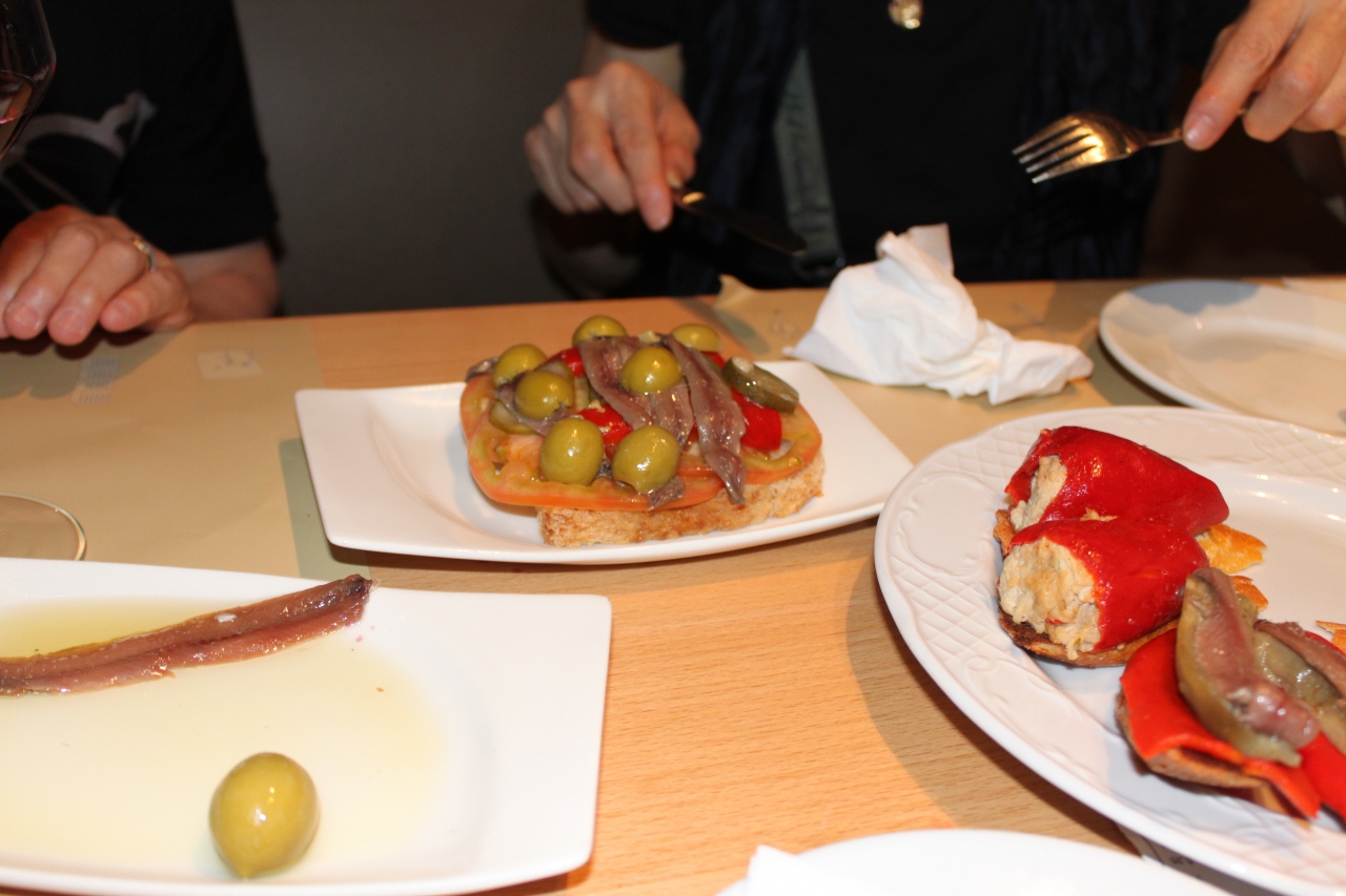 私たちは生ハム、海老の塩焼き、オムレツ、イワシの酢漬け、たらフライ、詰め物もの入りピーマン、等を食べました。温かいものは作り置きでなく、どれも熱々。どれもとても美味しく、賑やかで陽気な店内の雰囲気も手伝ってとても満足できました。バルでちょっとというより、ゆっくり時間があるとき着席しての方がよいように思います。ビールと赤ワイン2本を含めて4人分が約100ユーロ。また絶対行きたいと思ってます。