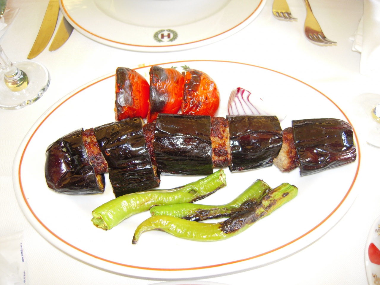 パトゥルジャル・ケバプ(茄子と挽肉を交互に串に刺して焼いた)が美味いとの口コミで、頼んだが、茄子の皮を剥かないと食べれなく、味もついていない。