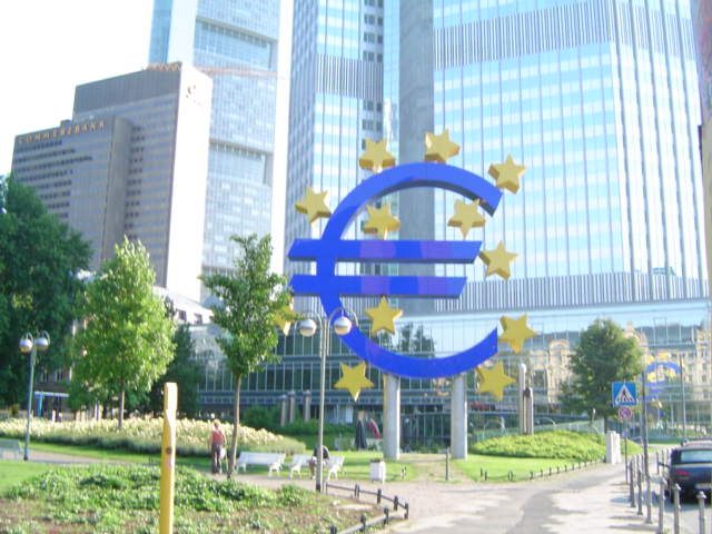 フランクフルトはゲーテハウスやレーマー広場だけじゃありません。何よりまず、フランクフルトには欧州中央銀行があります。その近代的なビルもいいですが、やはりユーロのマークのオブジェが素敵です。これは写真に収めておきましょう。