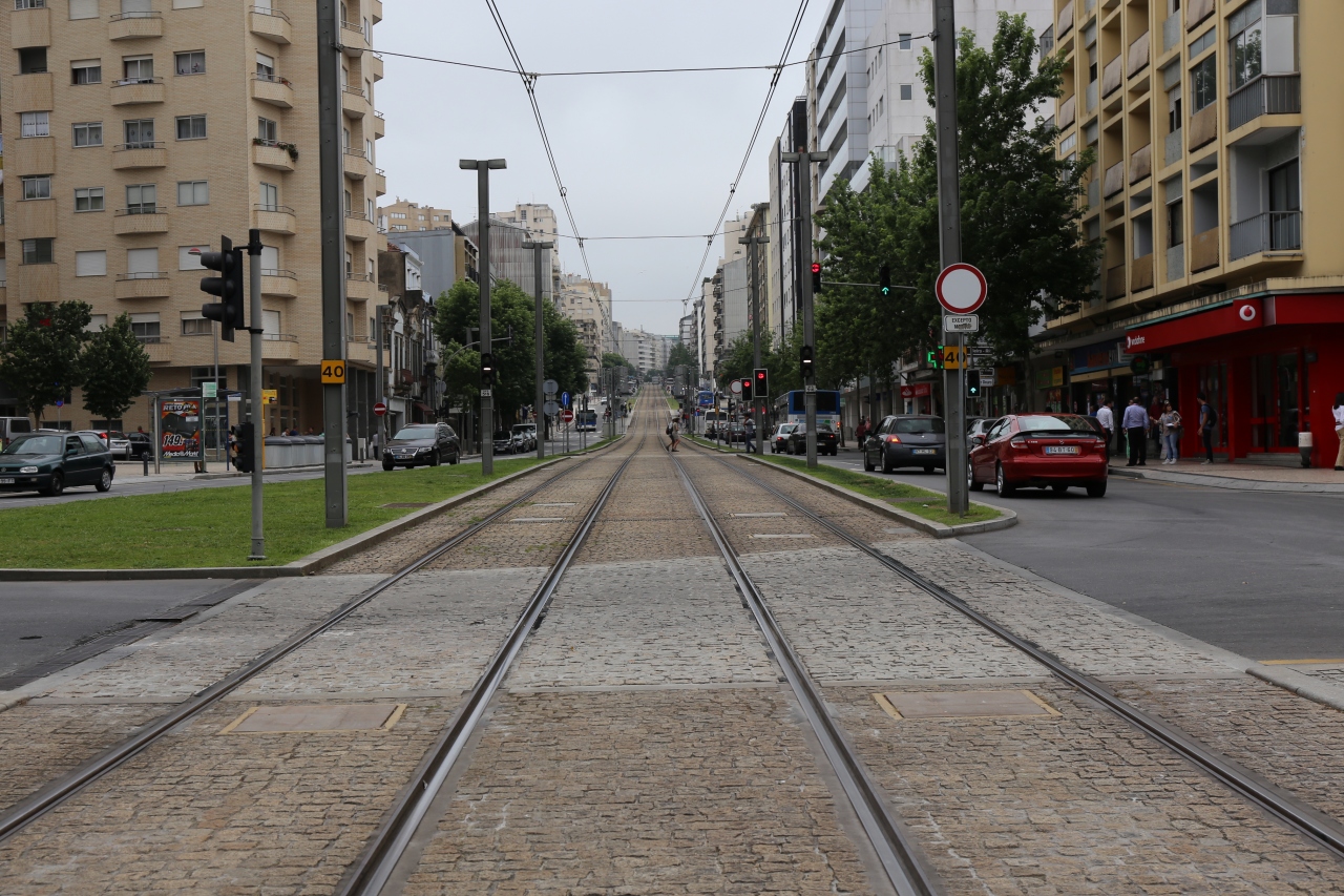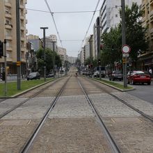 線路は道路と全く仕切りがなく、電車もゆっくり走っているので来たら避けられる。