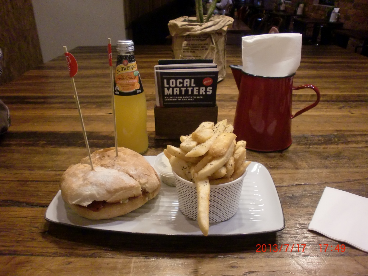 出来立てアツアツで持ってきてくれて、美味しくて大満足!私は一番小さなビーフバーガーを食べましたが、添えてあるフレンチフライがとっても美味しくて手が止まらない。ハーブマヨネーズをつけて食べますが、日本では食べたことがないほどフレンチフライが美味しい!もちろんハンバーガーも!