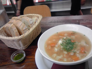 メニューは3種類。一番あっさりしていそうだと思って、白身魚のホワイトスープを注文。ラーメン丼大に具沢山スープがどーんと入って、パンと一緒に出てきます。手前の緑色の液体はバジルオイルと言っていたような。