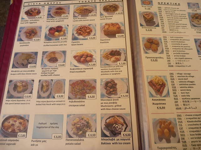 写真付きのメニューが親切。気軽にギリシャ料理が楽しめます