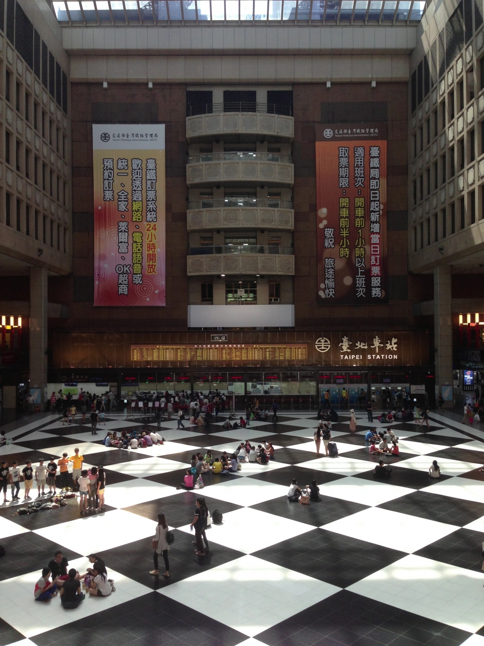 駅の中に入ると雑然としていて、あまり台北駅には来ないため何がどこにあるのかさっぱりわからない状態。とりあえず電車の時間まで時間があったので2階のレストラン街へ。レストラン街は結構お店があって、大戸屋やソニープラザなど日本のショップもいくつかありました。その2階のカフェから台北駅の中心を撮った写真がこれです。広い空間でここ何年かで改装されきれいになったと友人が言っていました。真ん中の空間は何もなく、電車待ちの人達がグループごとに地べたに座っていました。