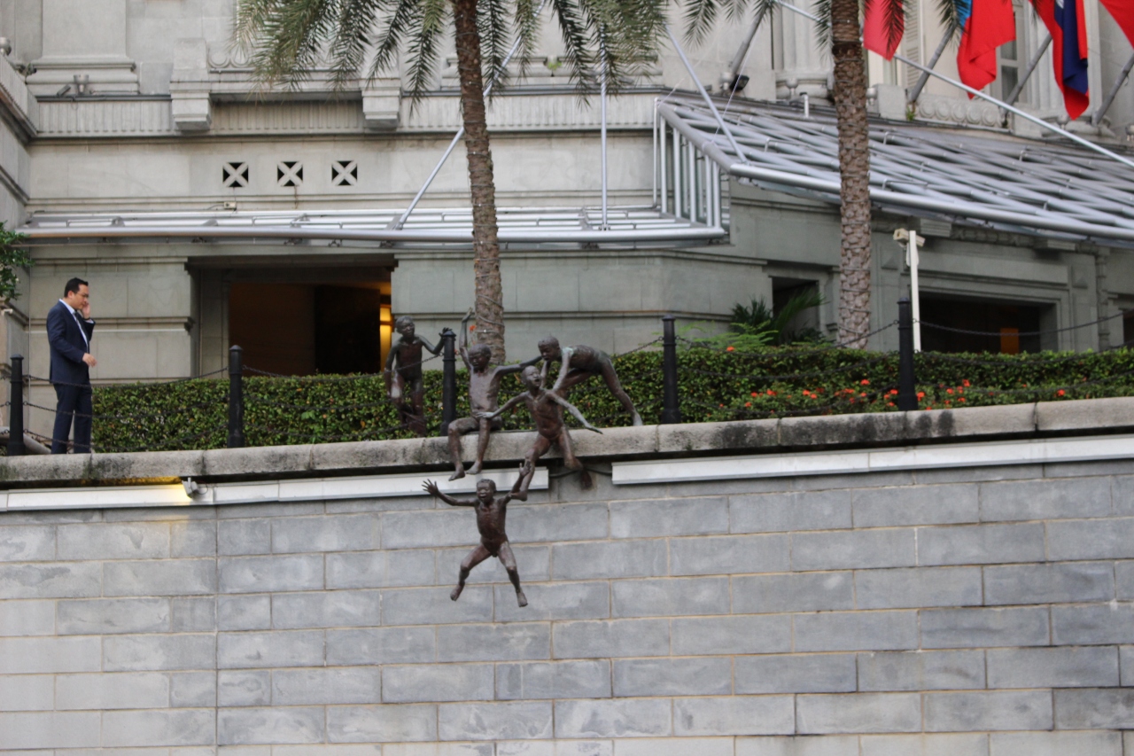 リバークルーズの途中で見かけました。旧マーライオン公園近くにある子どもたちがふざけて遊んでいると川に落っこちてしまったかのような像です。