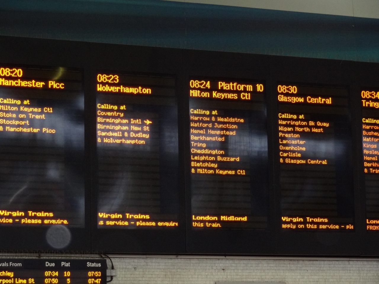 運用 ネットではトラブルが多いという評判でしたが、案の定?始発のユーストン駅では突然ポイントトラブルで?20分ほど遅延となり、発車10分前までホームが表示されませんでした。乗車してみると予約した席に予約ずみの表示がされておらず、予約なしで座っていたイギリス人老夫婦に他の席へ移ってもらうことになりました。でも帰りはトラブルがなかったので、イギリスの鉄道としてはうまくいった方かも知れません。