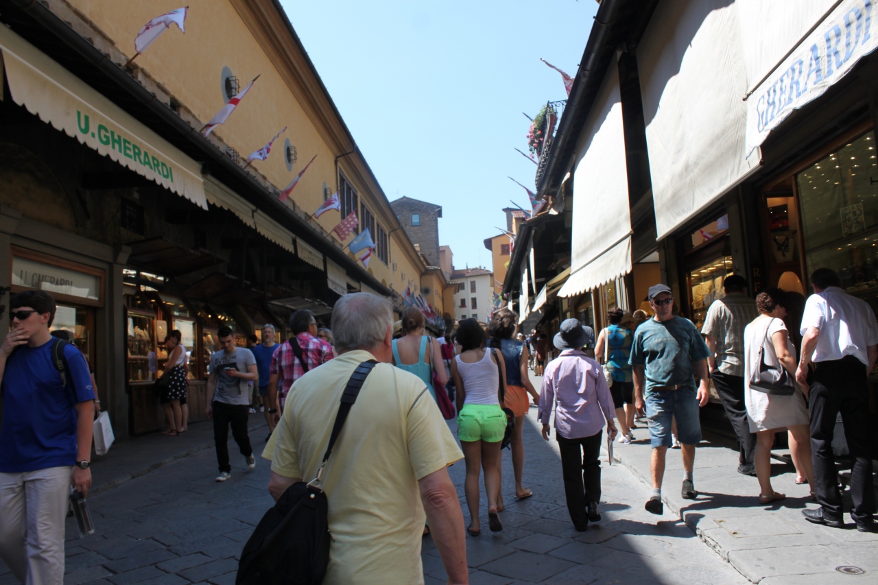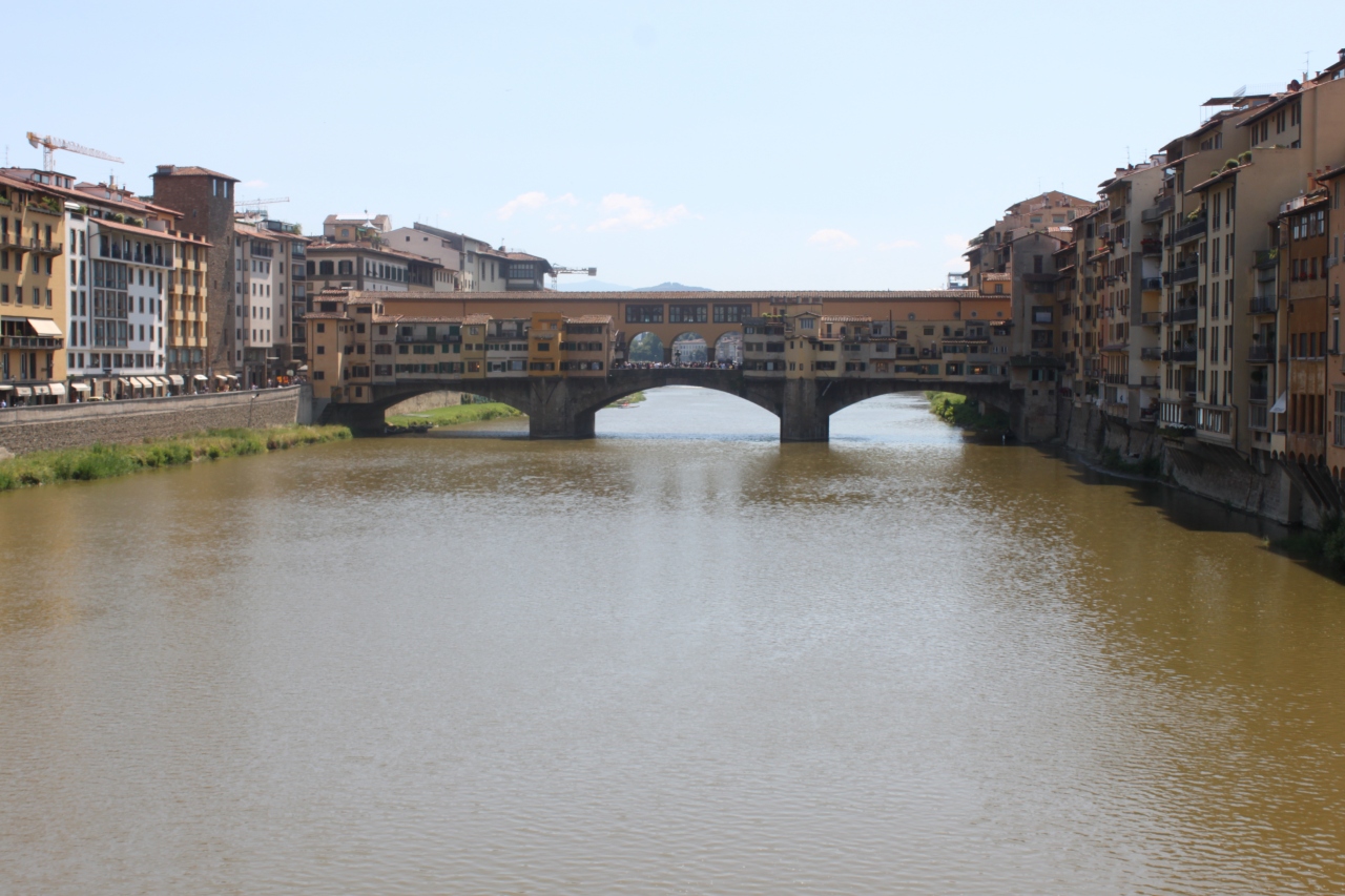 この橋は「花の都」のイメージからすると、ちょっと……。ガイド本などで見ていて有る程度の知識があるからそうがっかりはしないけど。確かに橋自体が商店街というのは珍しくはあるのでその点の希少価値はある。でも、私は橋はやっぱり美しいのが好き。川も淀んできれいでないし。川縁も歩くという感じでないし。