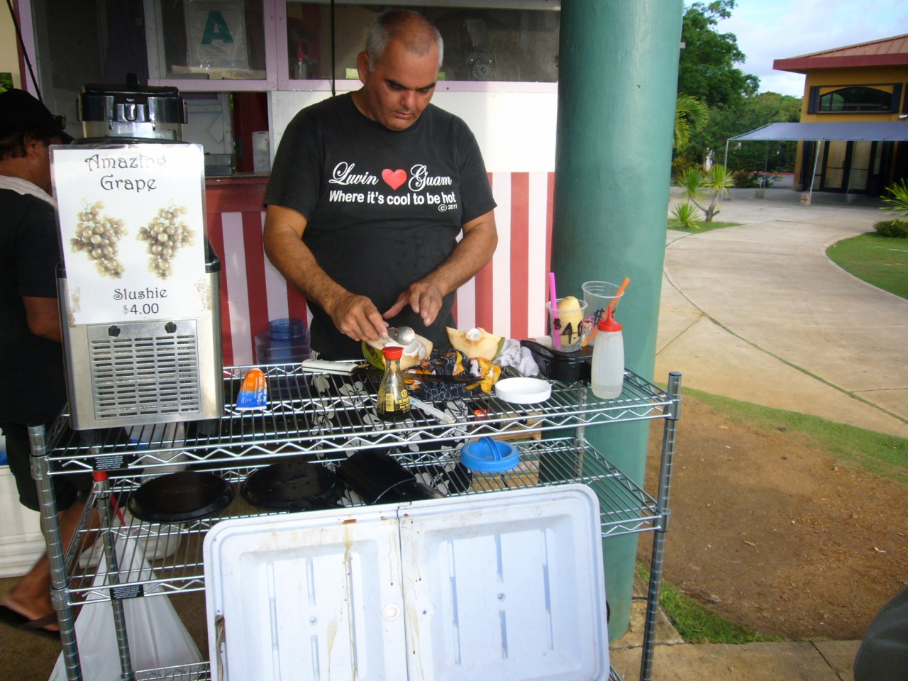 外にある出店でヤシの実ジュースを飲み、ヤシの実は刺身にしてもらって醤油をつけていただきました。これがむっちゃおいしい。ワサビがあれば最高だったのですが。