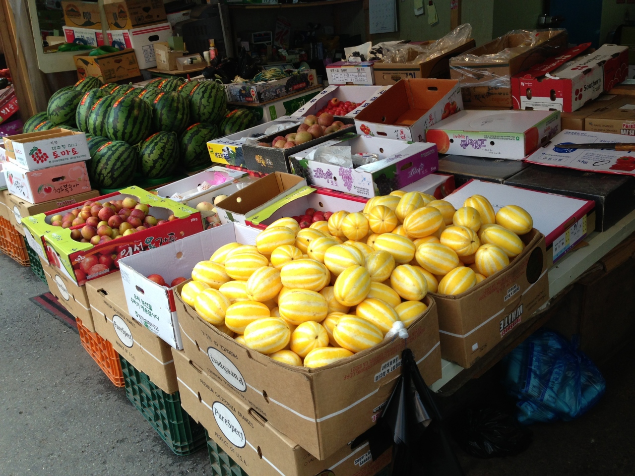 地下鉄孔徳駅を上がってすぐのこじんまりとした市場です。八百屋や魚屋、肉屋、餅屋、雑貨屋、ローカルなスーパーなど昭和の懐かしい雰囲気が漂いますが、幾種類もの山盛りの唐辛子や黄色いウリには韓国らしさが感じられます。大きなスイカやすももがとても美味しそうでした。
