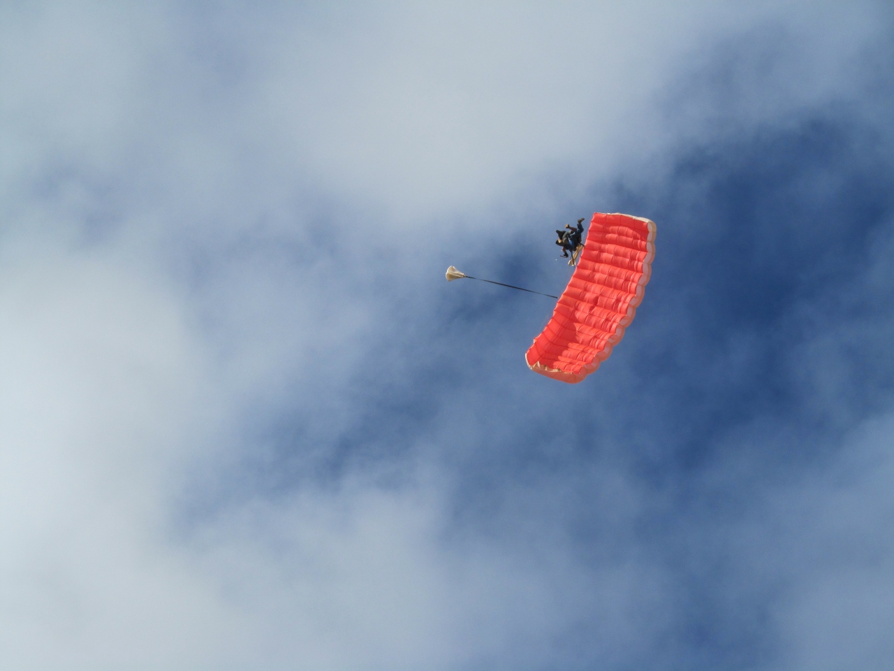 今回は見学です。見学場所に着いてすぐ、飛行機が飛んできたのが見えました。大きく旋回しながらどんどん小さくなっていきます。一瞬目を離すと見失うくらい小さくなった頃、飛行機から粒のように人が飛び出しました。パラシュートが開いてからしか目視できないと思っていたので、飛び出す瞬間から見えたのはびっくりでした。見学も楽しかったです。飛んだ家族の1人はパラシュートが開いてからの遊泳飛行に酔ってしまい、かわいそうなことになっていました。酔いやすい人は酔い止め持参をおすすめします。