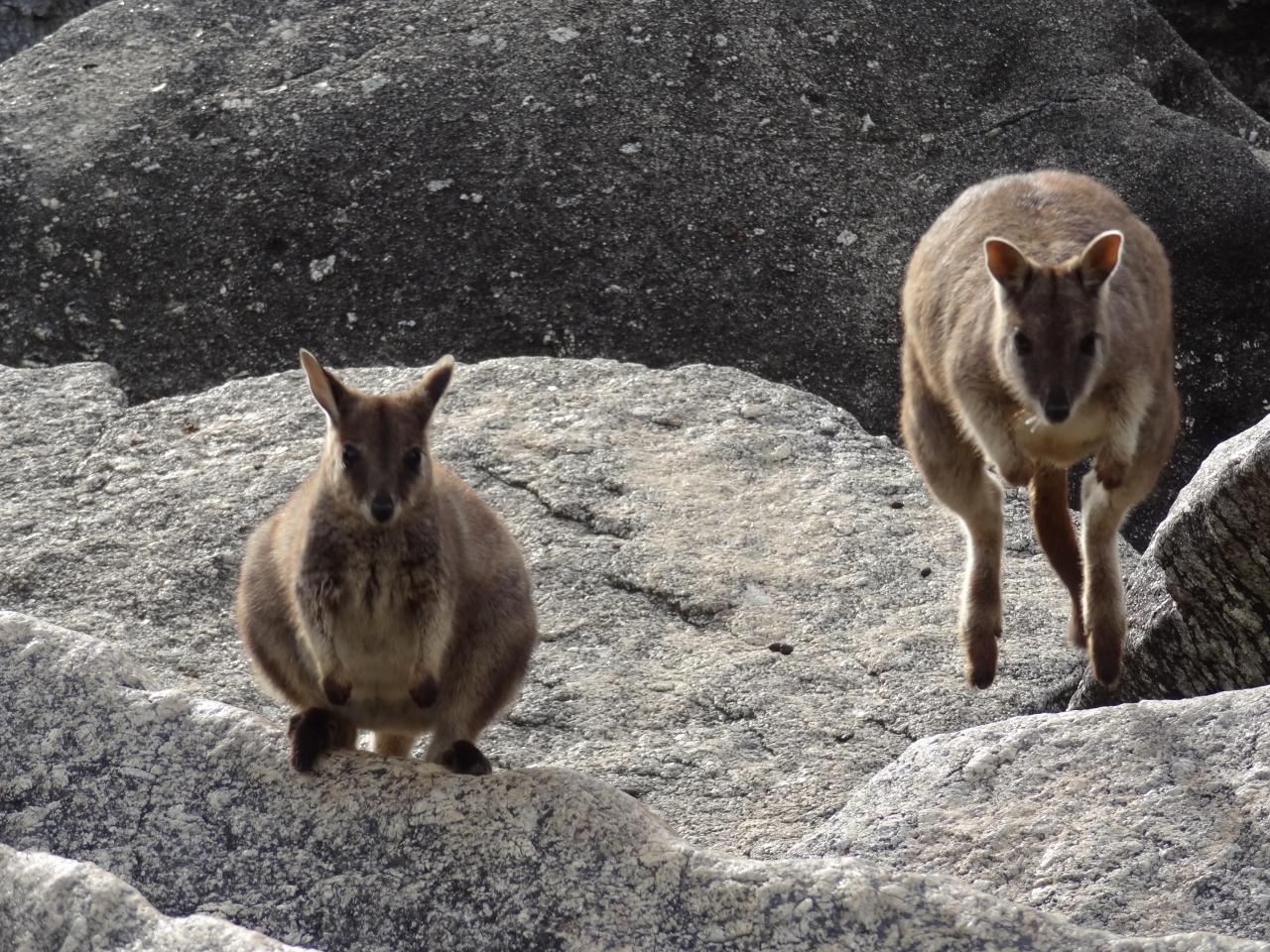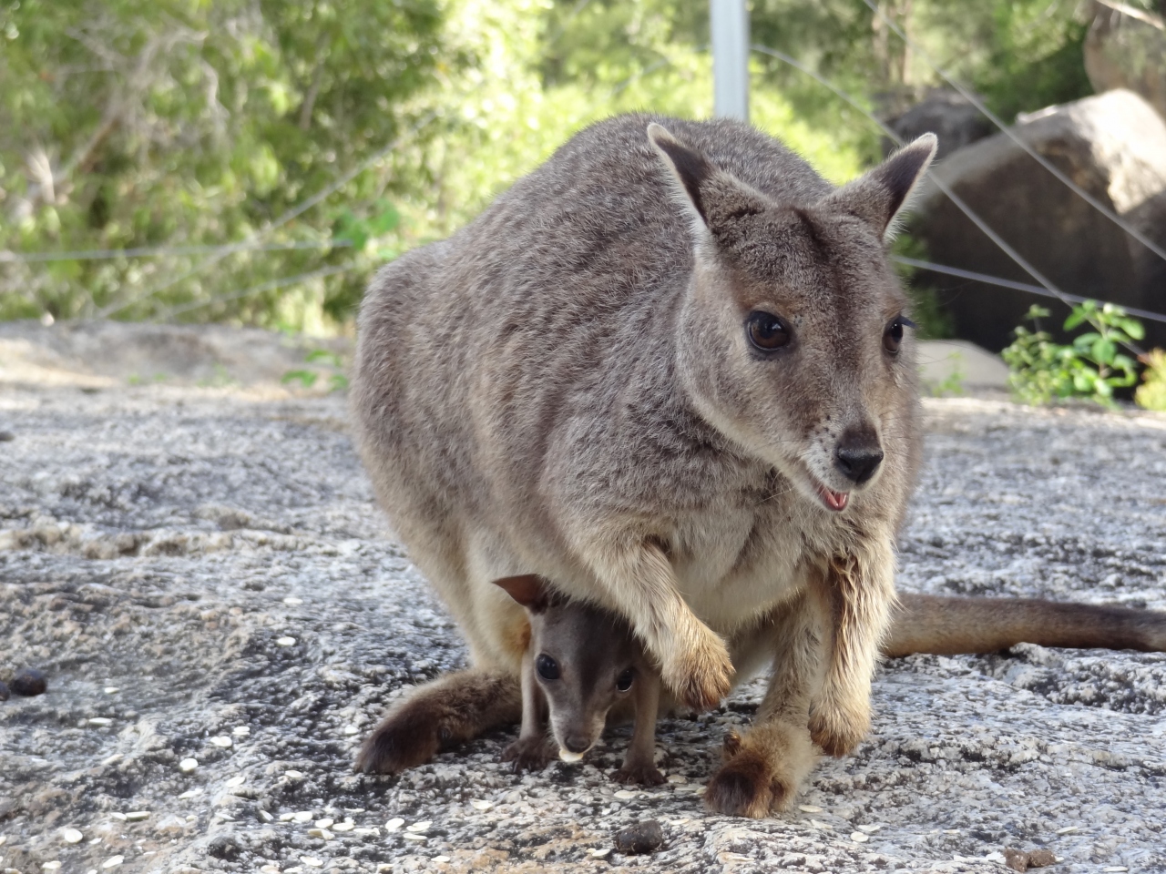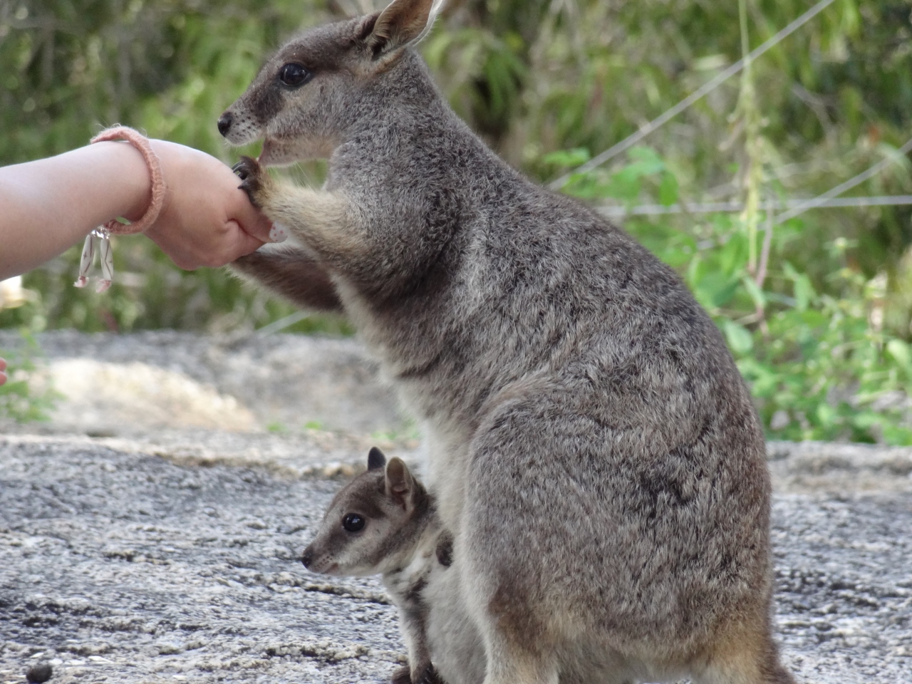 ロックワラビーの餌付けは、次から次へと野生のロックワラビーが餌を食べに来る姿がとても可愛いく、お母さんの嚢の中にいる子供のロックワラビーも至近距離で見ることができました。