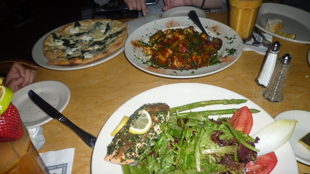 ラスベガスのストリップ沿いにある、ショッピングモール「フォーラムショップス」内のthe cheesecake factoryに訪れました。モールがとても広いので、たどり着くまでけっこう歩きました。少し待って、席に着きました。パスタやサラダなどを注文しましたが、どれも量が多く、三人でシェアしてすぐ満腹になりました。サービスも素晴らしく、注文するたび"Absolutely.(もちろん!)"と答えてくれたのが印象的です。おなか一杯になったのでケーキは持ち帰りしました。