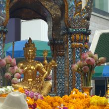 バンコク1のご利益があるというエラワン・プームです。必ず中でお花とお線香とろうそくを買ってください。外で買うと高いです。1セット50バーツです。4面ありますので、それぞれにお祈りしてください。タイ人の方々の熱心なお祈りを見ているとそれだけでもご利益ありそうです。お祈りしたことがかなうと、お礼として踊りを寄進するそうです。