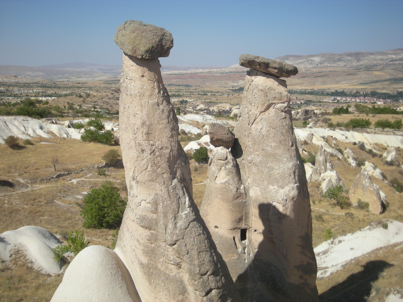 「スリーシスターズ(ウルギュップ)」。カッパドキアのウルギュップエリアにあり、 スリムな岩に小さな頭(帽子?)がのっかっているキノコ岩?が3つ並んでいるのがここ”三姉妹(スリーシスターズ)岩”です。ちなみに、他の国(オーストラリアのブルーマウンテンに同じ名称の景勝地があります。同じく世界遺産)も同じネーミングで命名された3つの岩の景色がありますね。このカッパドキアのスリーシスターズの方が可愛い感じの岩ですね。3つの印象的な岩などが並ぶとどこでも同じネーミングの発想になるのですかね。