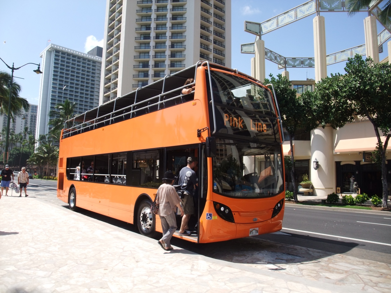ワイキキ・アラモアナ ショピングコースのピンク・ライン、ハワイ歴史観光コースのレッド・ライン、ダイヤモンドヘッド観光コースのグリーン・ラインの3コースあり、どれも窓のないトロリーバスで、2階建てバスもあります。