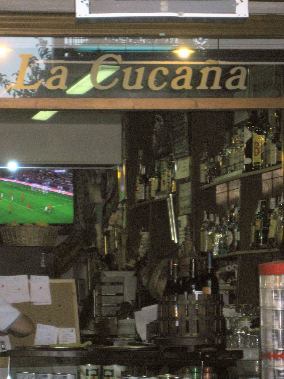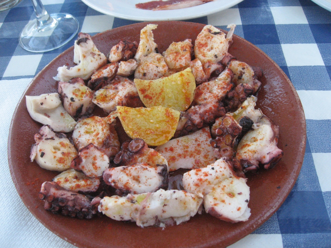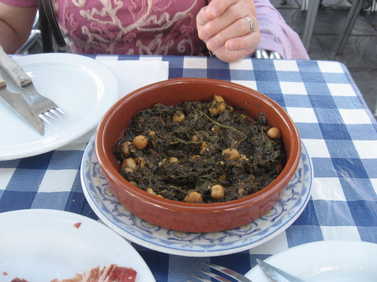 ほうれん草とひよこ豆のソテー、生ハム、たこのそてー、イカスミのパエリア、ワインを注文。。ほうれん草とひよこ豆はスペインで有名な料理で美味しいが、量が多すぎなのと色がきれいでないところが今ひとつ。でも、眺めも味も堪能しながら楽しい時間だった。