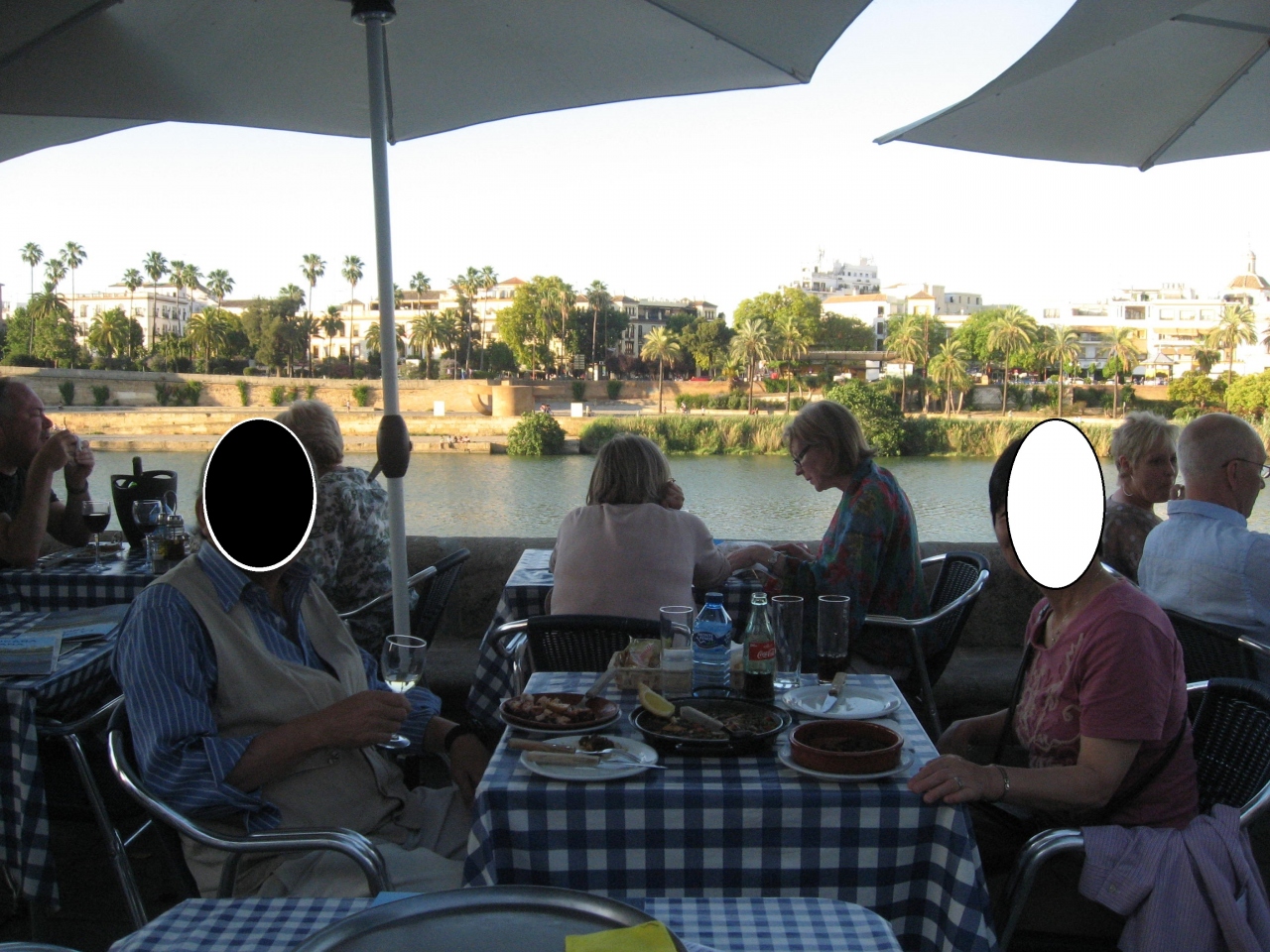 新市街にも行ってみようとクワダルキビル川を渡ってみた。旧市街側の川沿いは何も店は出ていないが新市街の方は川沿いにずらっと店が並ぶ。そのうちの1軒で若いウエーターが熱心に誘うので、川風に吹かれながらの食事も良いのでは、と席に着いた。